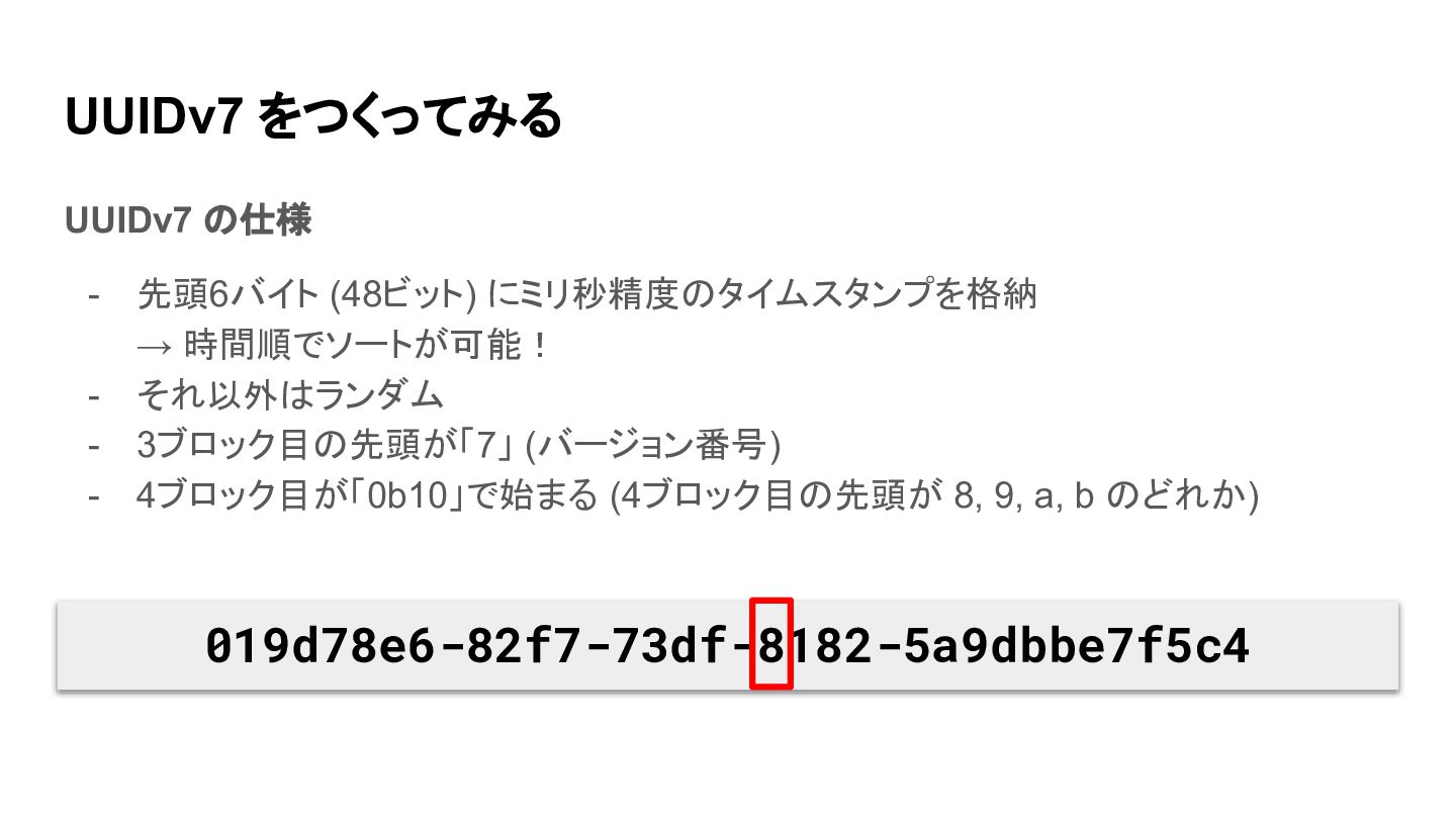- それ以外はランダム - 3ブロック目の先頭が「7」 (バージョン番号) - 4ブロック目が「0b10」で始まる (4ブロック目の先頭が 8, 9, a, b のどれか) 019d78e6-82f7-73df-8182-5a9dbbe7f5c4