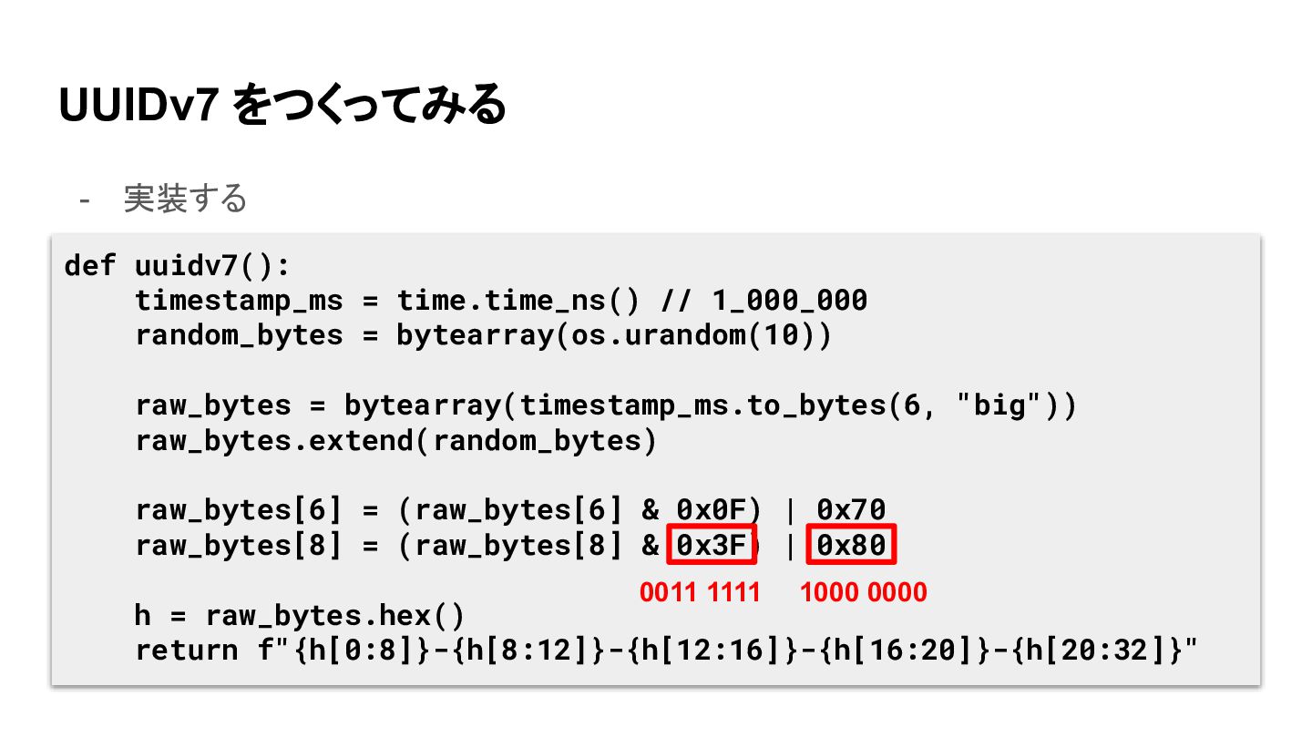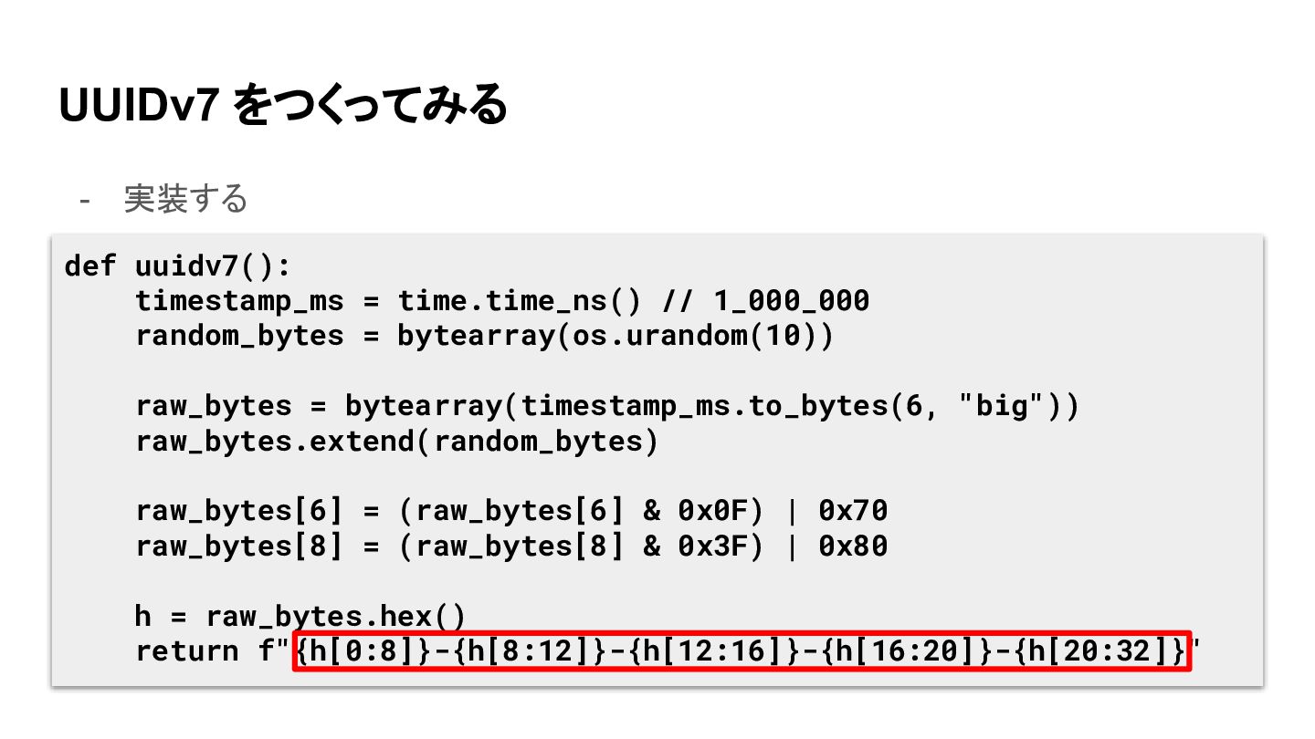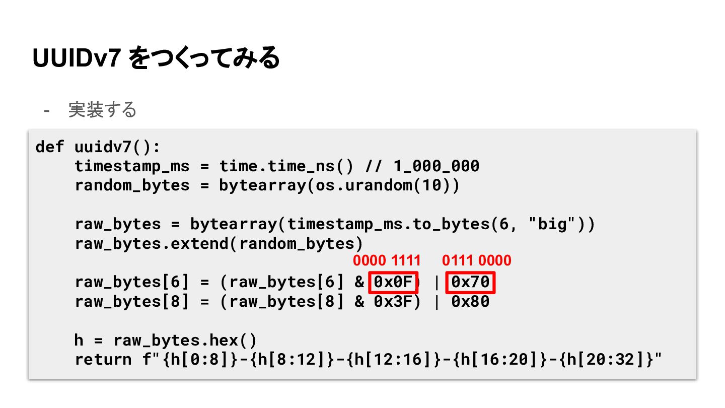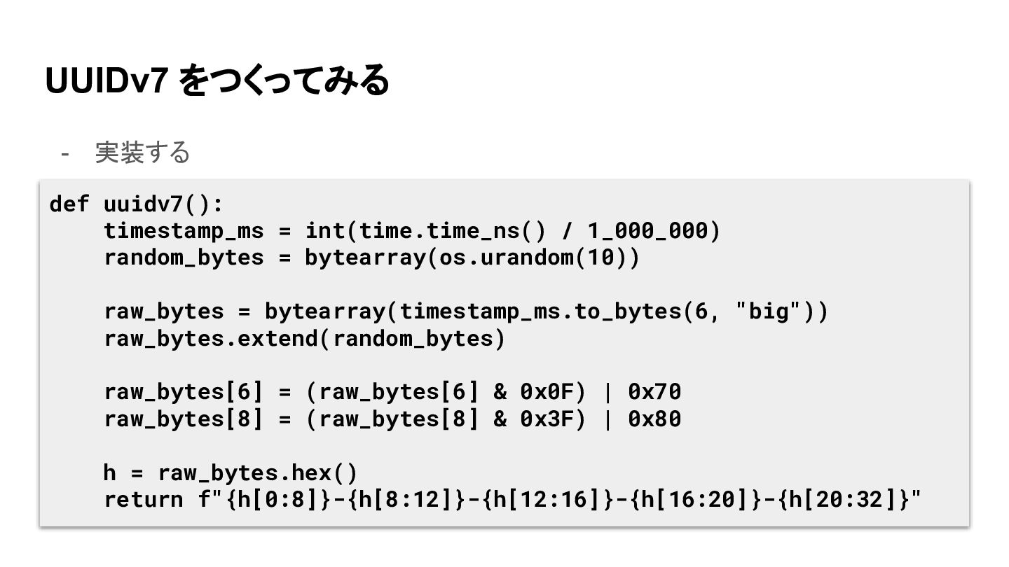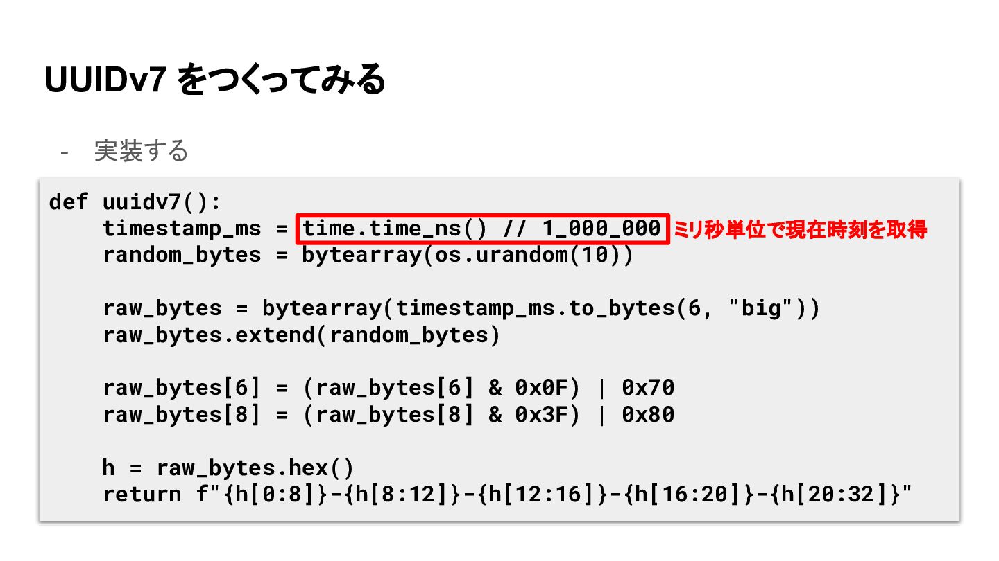 UUIDv7 をつくってみる - 実装する def uuidv7(): timestamp_ms = time.time_ns() //