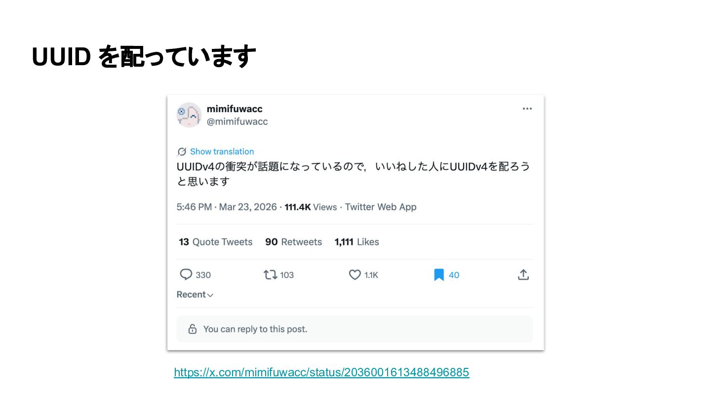 UUID を配っています https://x.com/mimifuwacc/status/2036001613488496885
