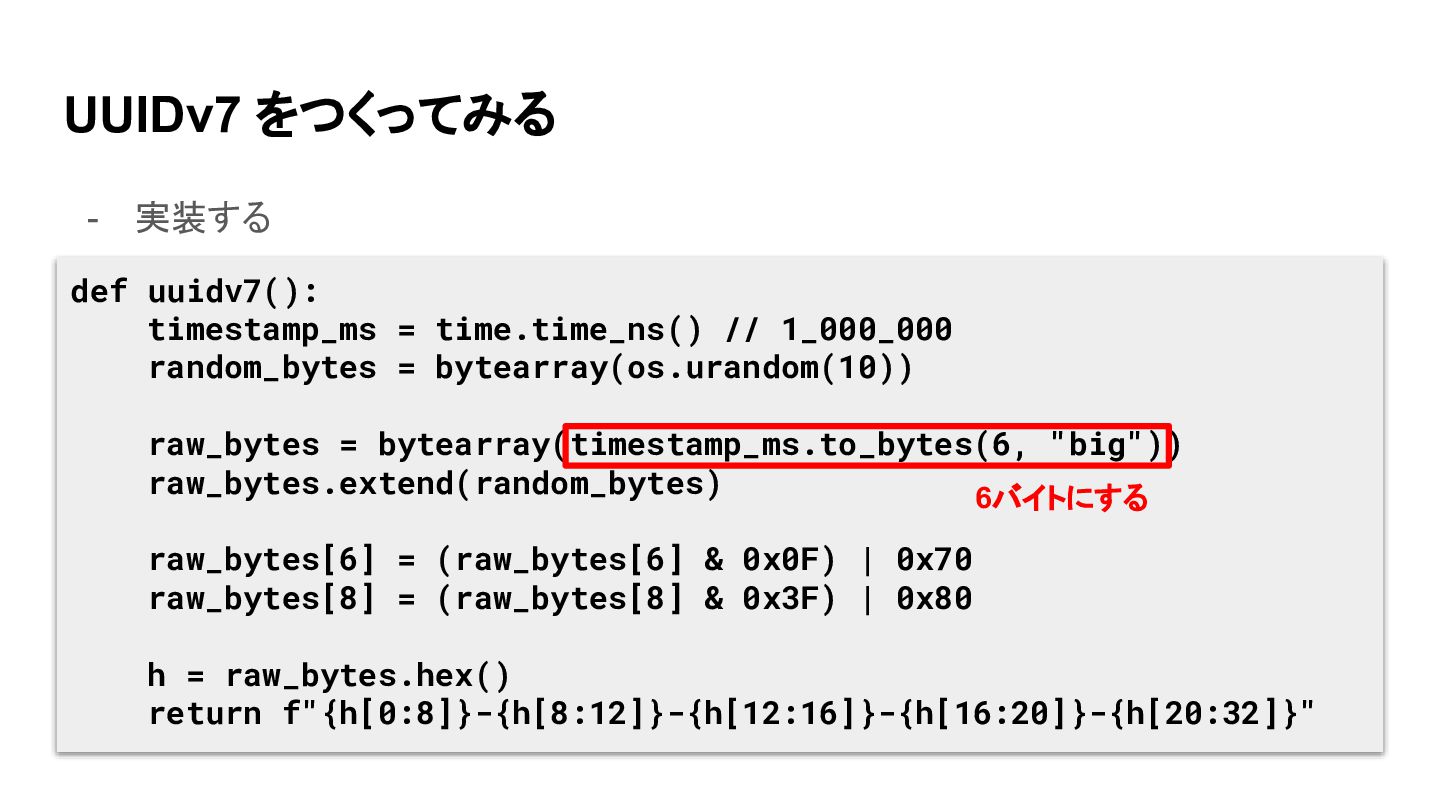 1_000_000 random_bytes = bytearray(os.urandom(10)) raw_bytes = bytearray(timestamp_ms.to_bytes(6, "big")) raw_bytes.extend(random_bytes) raw_bytes[6] = (raw_bytes[6] & 0x0F) | 0x70 raw_bytes[8] = (raw_bytes[8] & 0x3F) | 0x80 h = raw_bytes.hex() return f"{h[0:8]}-{h[8:12]}-{h[12:16]}-{h[16:20]}-{h[20:32]}" 6バイトにする