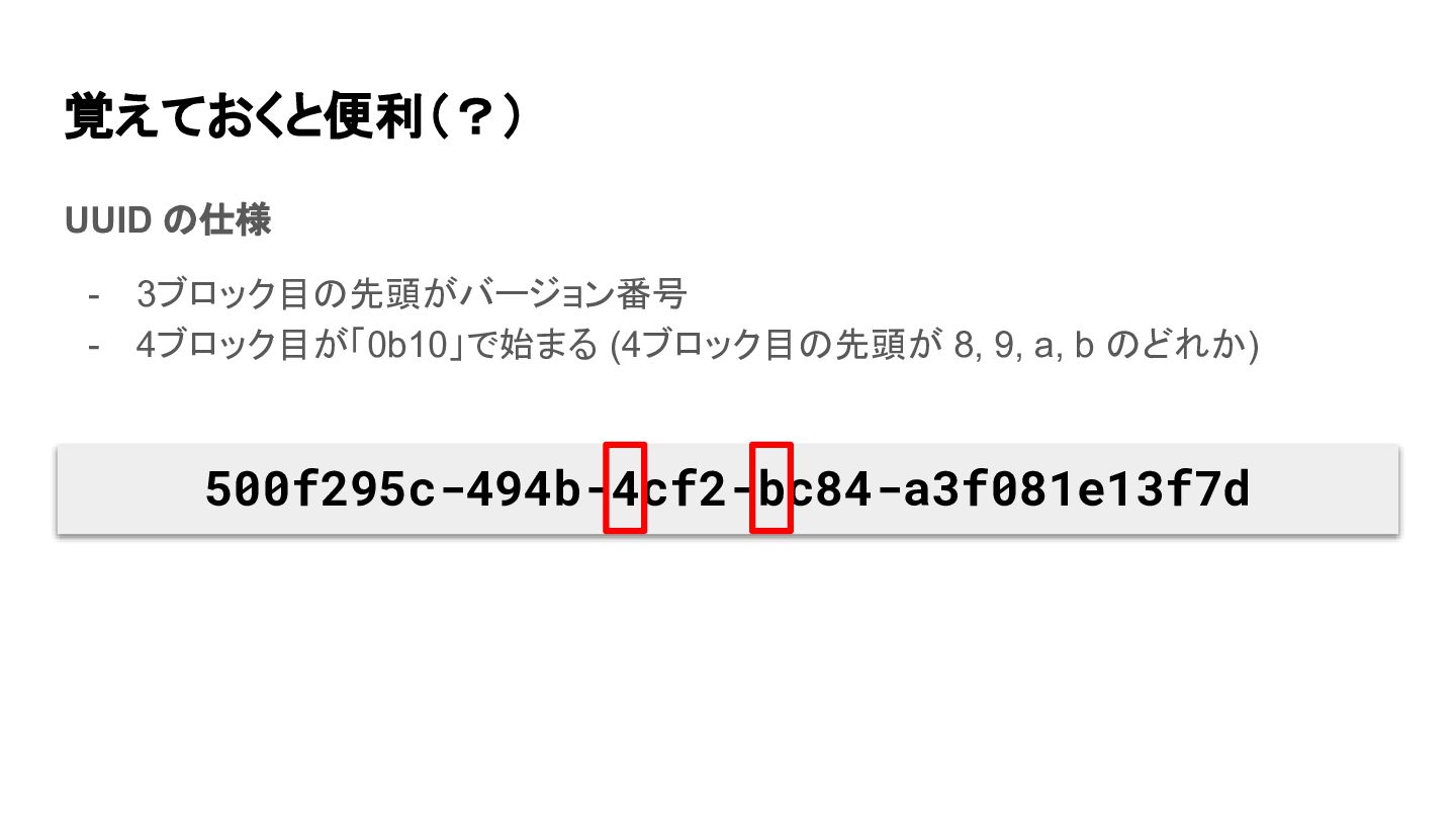 覚えておくと便利(?) UUID の仕様 - 3ブロック目の先頭がバージョン番号 - 4ブロック目が「0b10」で始まる (4ブロック目の先頭が 8, 9,