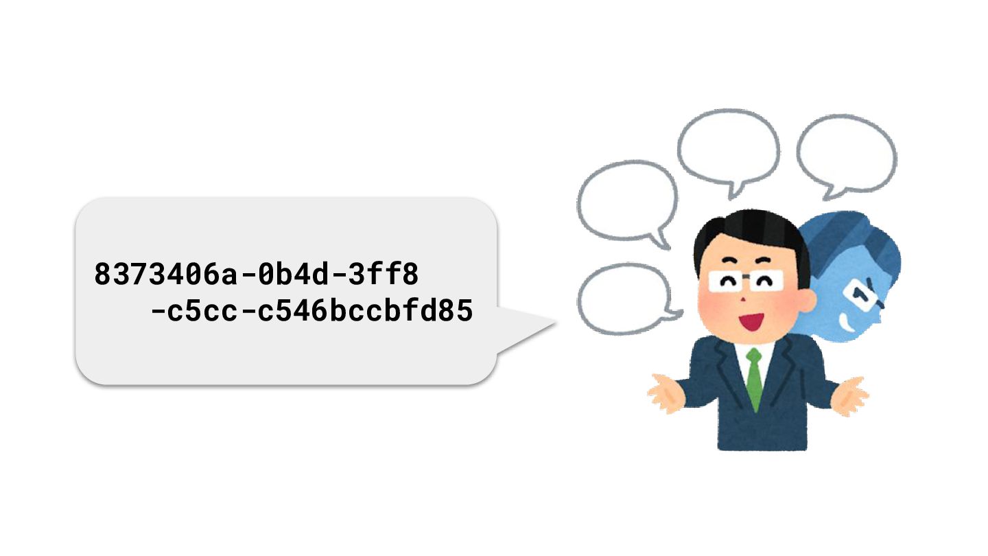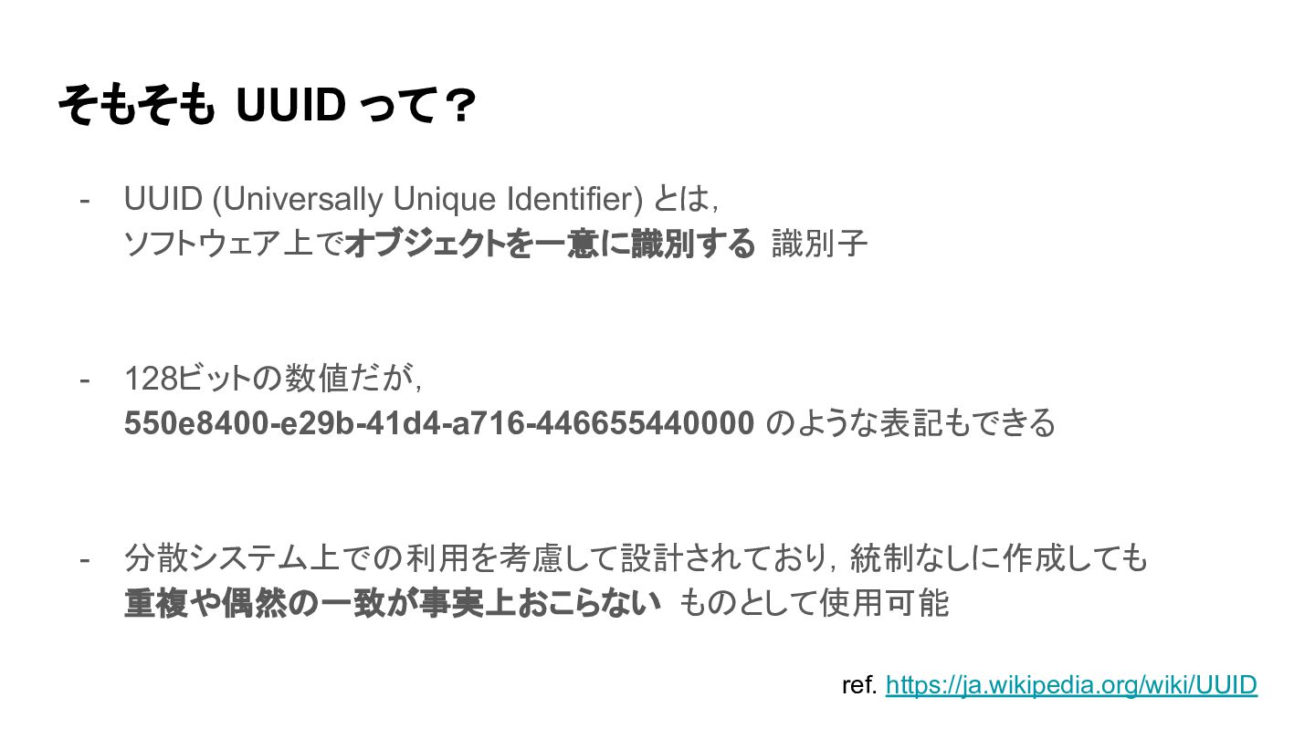 識別子 - 128ビットの数値だが, 550e8400-e29b-41d4-a716-446655440000 のような表記もできる - 分散システム上での利用を考慮して設計されており,統制なしに作成しても 重複や偶然の一致が事実上おこらない ものとして使用可能 ref. https://ja.wikipedia.org/wiki/UUID