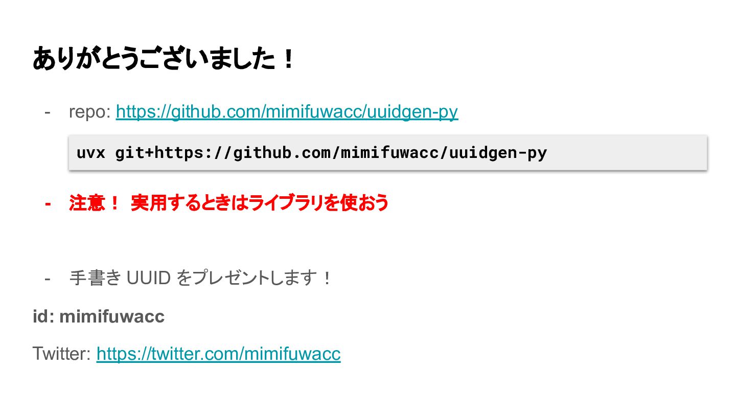 ありがとうございました! - repo: https://github.com/mimifuwacc/uuidgen-py uvx git+https://github.com/mimifuwacc/uuidgen-py id: mimifuwacc Twitter: https://twitter.com/mimifuwacc