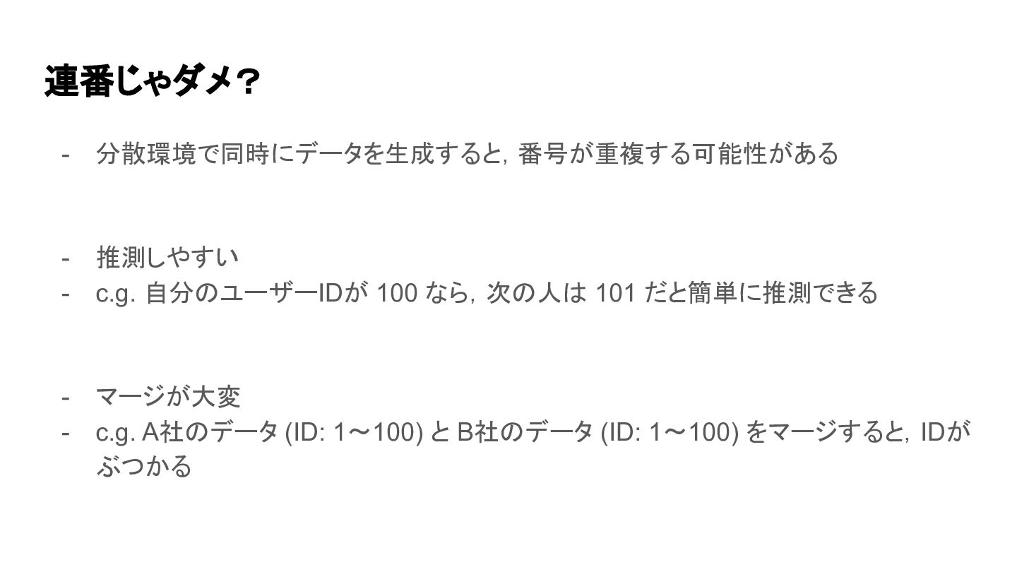 連番じゃダメ? - 分散環境で同時にデータを生成すると,番号が重複する可能性がある - 推測しやすい - c.g. 自分のユーザーIDが 100 なら,次の人は