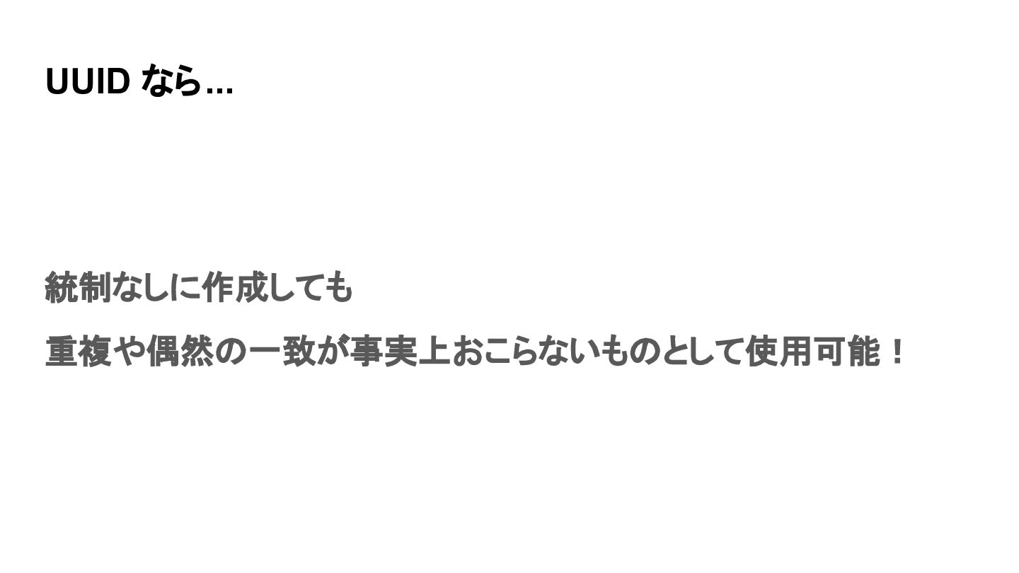 UUID なら... 統制なしに作成しても 重複や偶然の一致が事実上おこらないものとして使用可能!