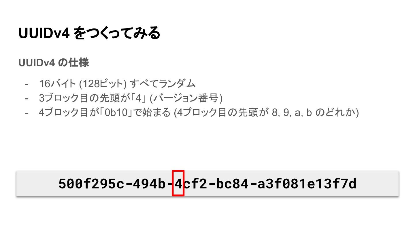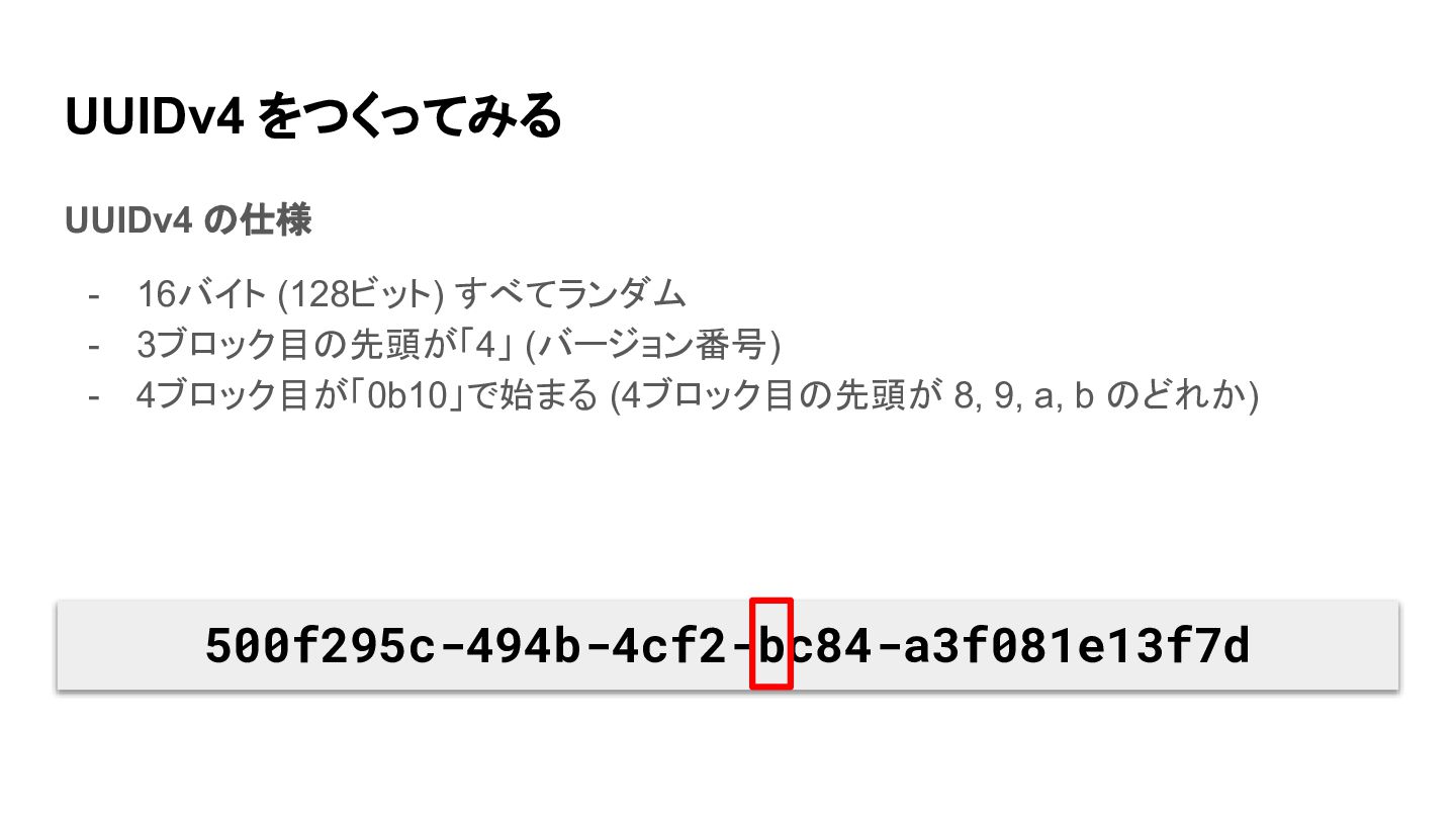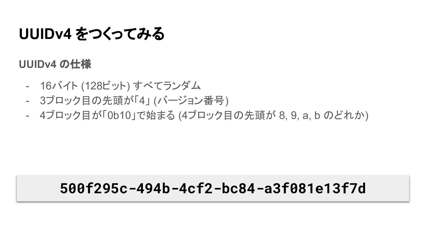 UUIDv4 をつくってみる UUIDv4 の仕様 - 16バイト (128ビット) すべてランダム - 3ブロック目の先頭が「4」
