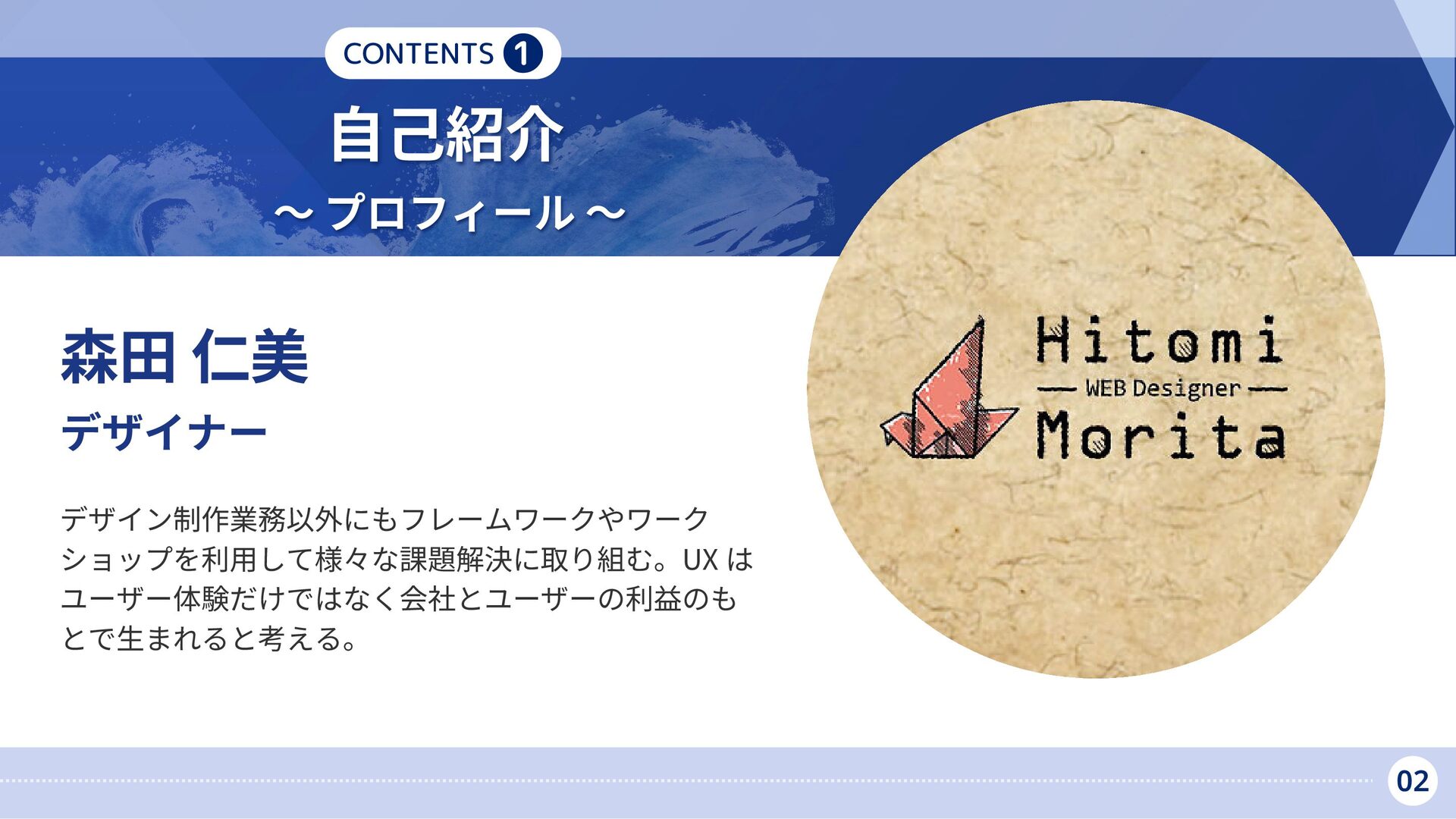 02 ❶ CONTENTS 自己紹介 ~ プロフィール ~ デザイン制作業務以外にもフレームワークやワーク ショップを利用して様々な課題解決に取り組む。UX は