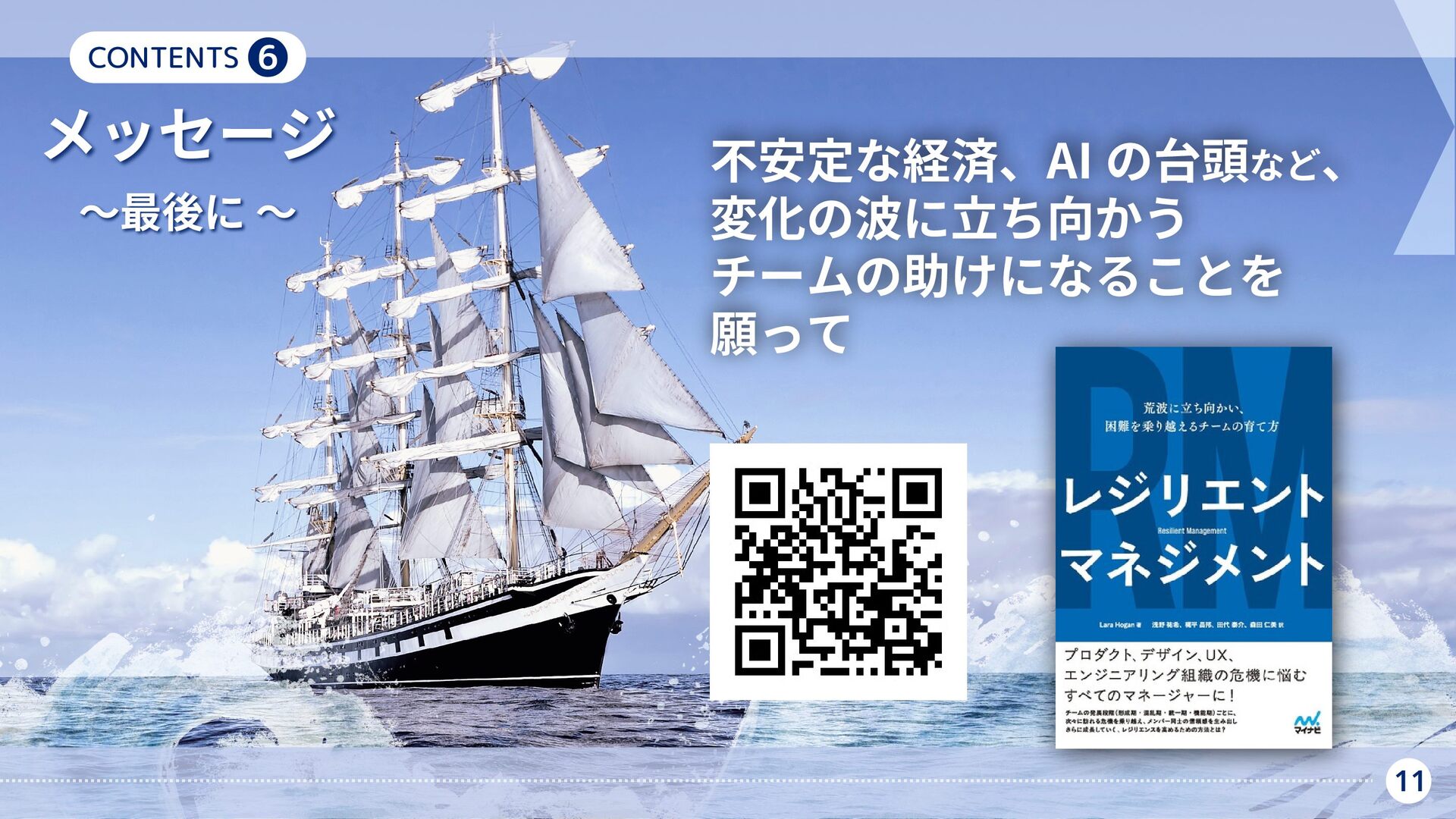 11 ❻ CONTENTS メッセージ ~最後に ~ 不安定な経済、AI の台頭など、 変化の波に立ち向かう チームの助けになることを
