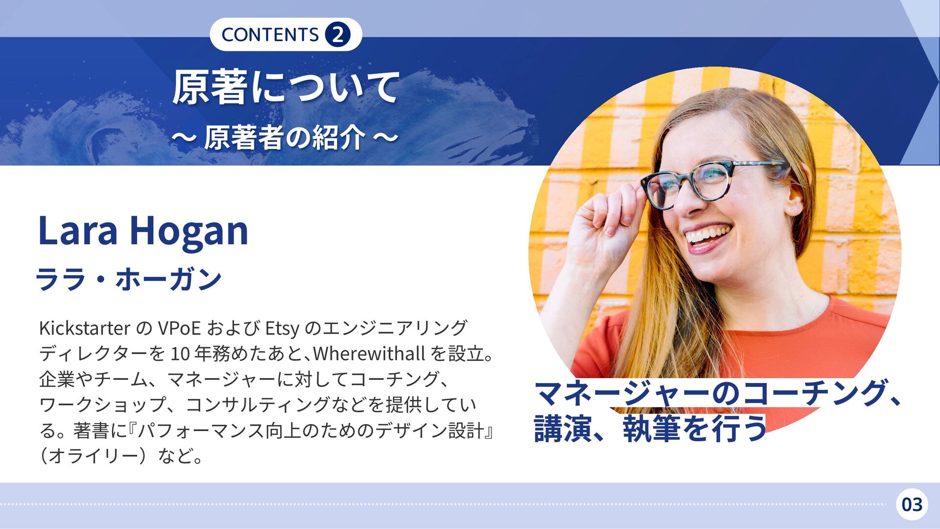 および Etsy のエンジニアリング ディレクターを �� 年務めたあと、 Wherewithall を設立。 企業やチーム、マネージャーに対してコーチング、 ワークショップ、コンサルティングなどを提供してい る。著書に 『パフォーマンス向上のためのデザイン設計』 (オライリー)など。 マネージャーのコーチング、 講演、執筆を行う Lara Hogan ララ・ホーガン
