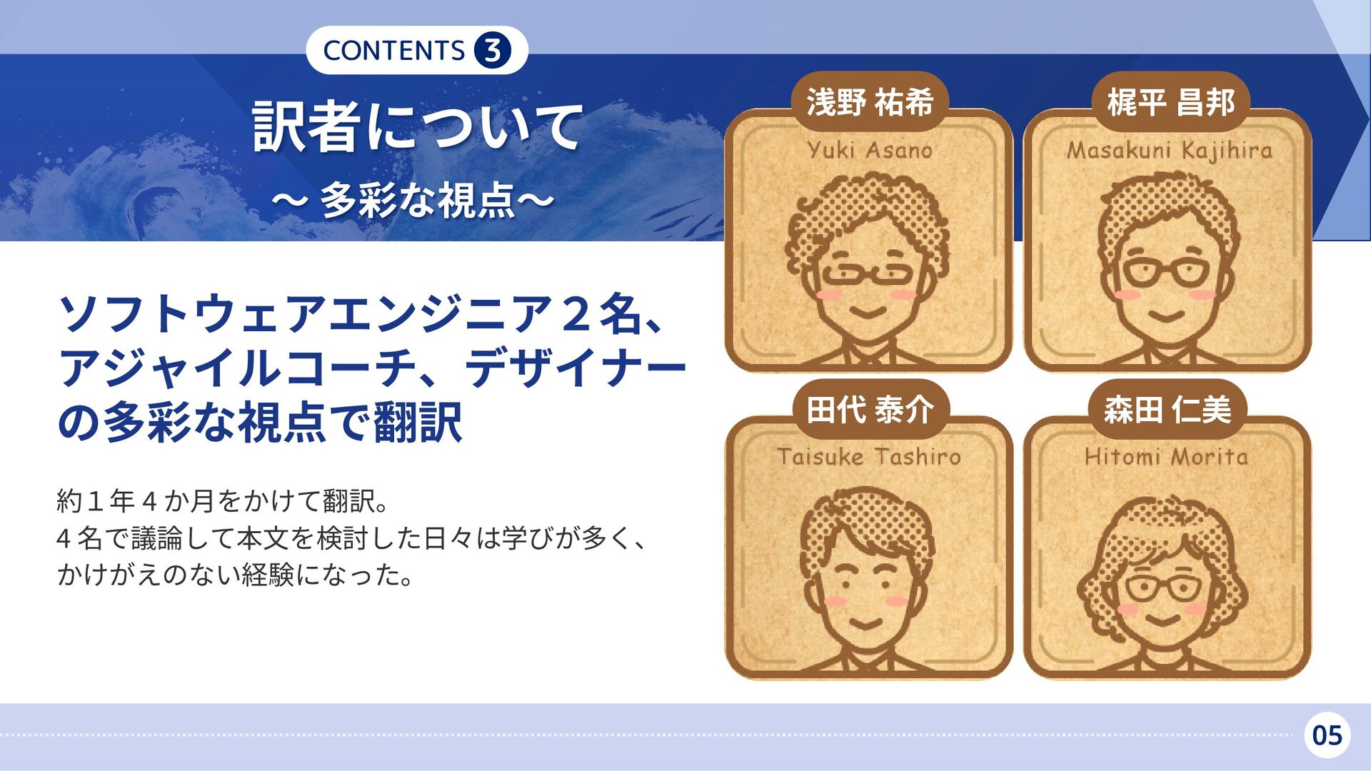 名で議論して本文を検討した日々は学びが多く、 かけがえのない経験になった。 ソフトウェアエンジニア2名、 アジャイルコーチ、デザイナー の多彩な視点で翻訳 浅野 祐希 梶平 昌邦 田代 泰介 森田 仁美