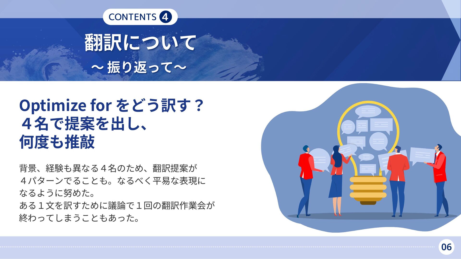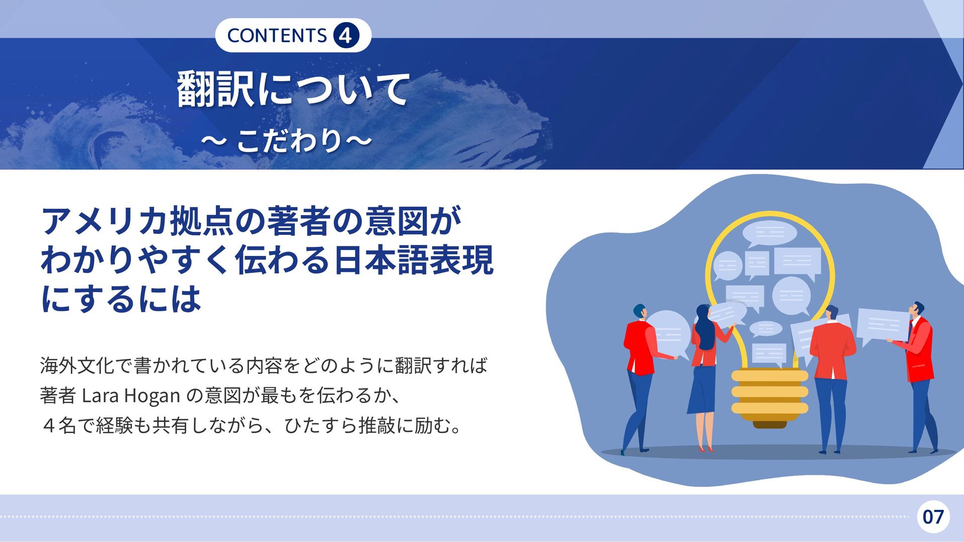 06 ❹ CONTENTS 翻訳について ~ 振り返って~ 背景、経験も異なる4名のため、翻訳提案が 4パターンでることも。なるべく平易な表現に なるように努めた。 ある1文を訳すために議論で1回の翻訳作業会が