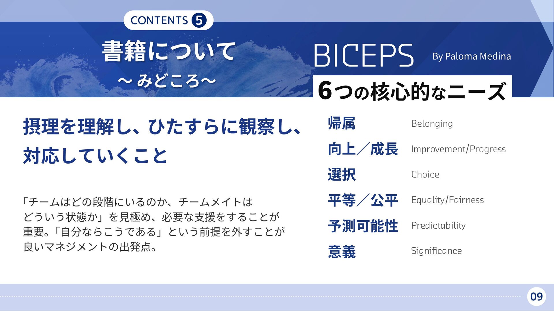 良いマネジメントの出発点。 摂理を理解し、ひたすらに観察し、 対応していくこと �つの核心的なニーズ By Paloma Medina 帰属 向上/成長 選択 平等/公平 予測可能性 意義 Belonging Improvement/Progress Choice Equality/Fairness Predictability Signi cance BICEPS