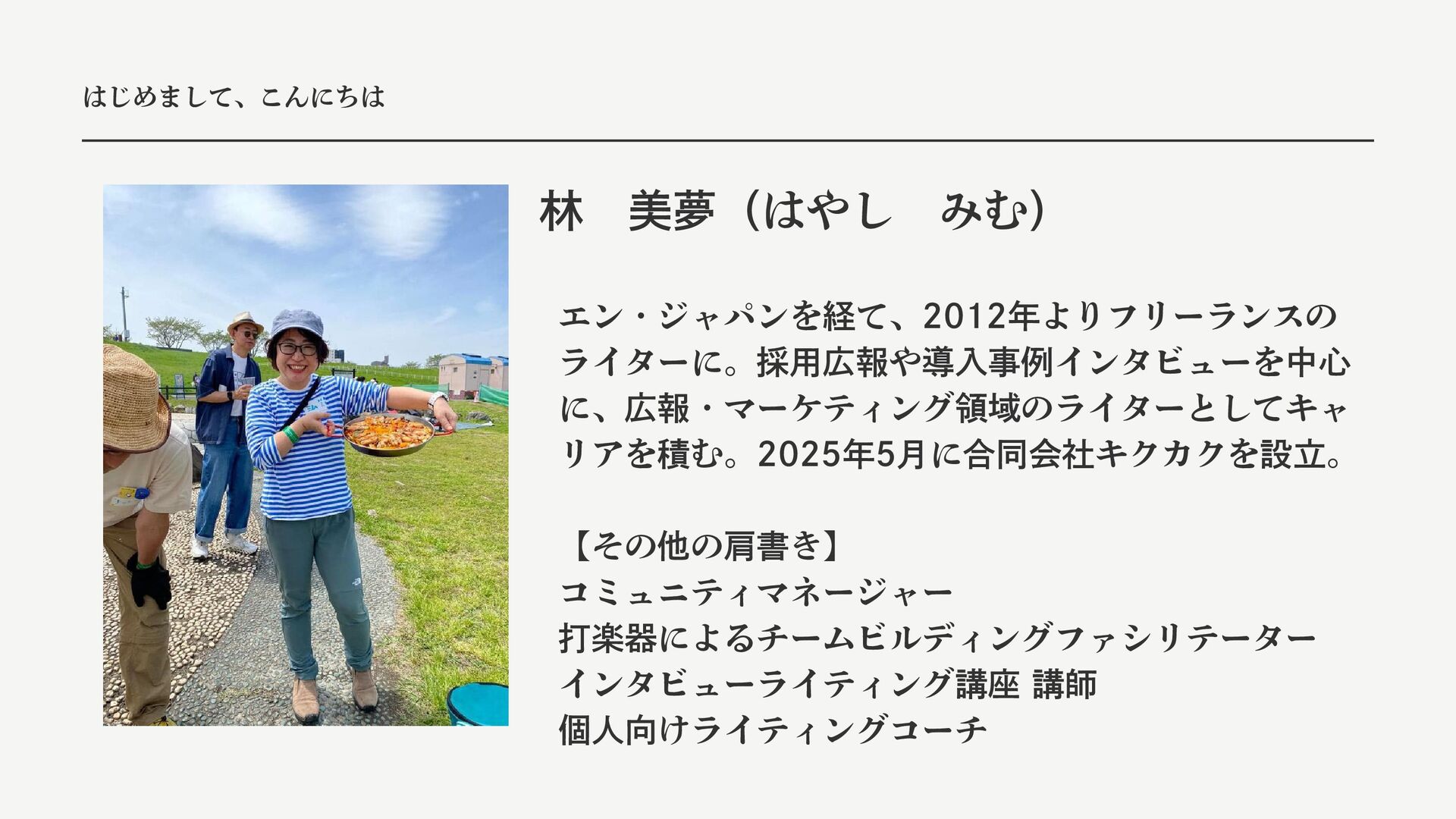 はじめまして、こんにちは 林 美夢(はやし みむ) エン・ジャパンを経て、2012年よりフリーランスの ライターに。採用広報や導入事例インタビューを中心 に、広報・マーケティング領域のライターとしてキャ リアを積む。2025年5月に合同会社キクカクを設立。 【その他の肩書き】 コミュニティマネージャー 打楽器によるチームビルディングファシリテーター