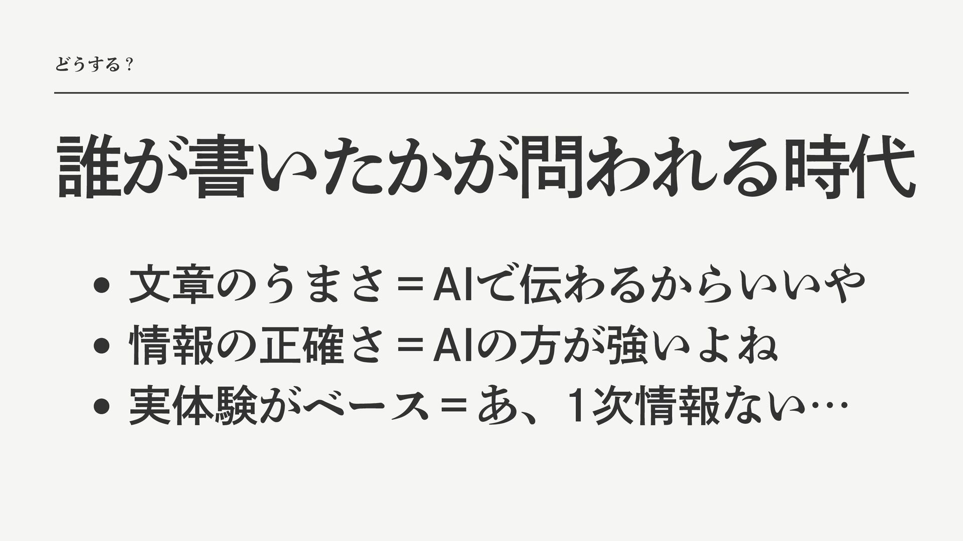 どうする? 誰が書いたかが問われる時代 文章のうまさ=AIで伝わるからいいや 情報の正確さ=AIの方が強いよね 実体験がベース=あ、1次情報ない…