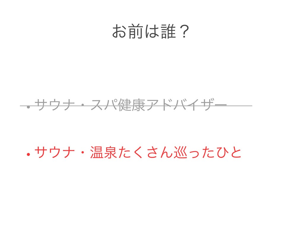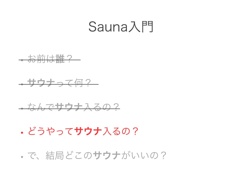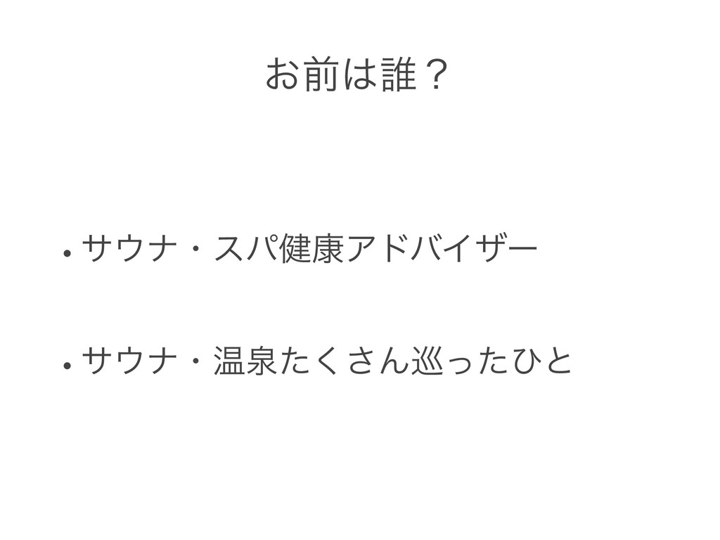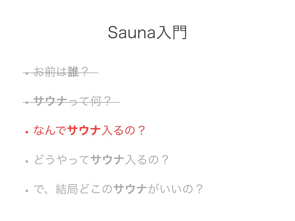 サウナって何? なんでサウナなんか行くの? なんでわざわざ熱い部屋にお金払って入るの? サウナ好きが「ととのう」とか言ってるのは一体何? といった疑問をお持ちの方と、ホモ・サピエンスの方全てに見ていただきたい、サウナの手引きスライドです。