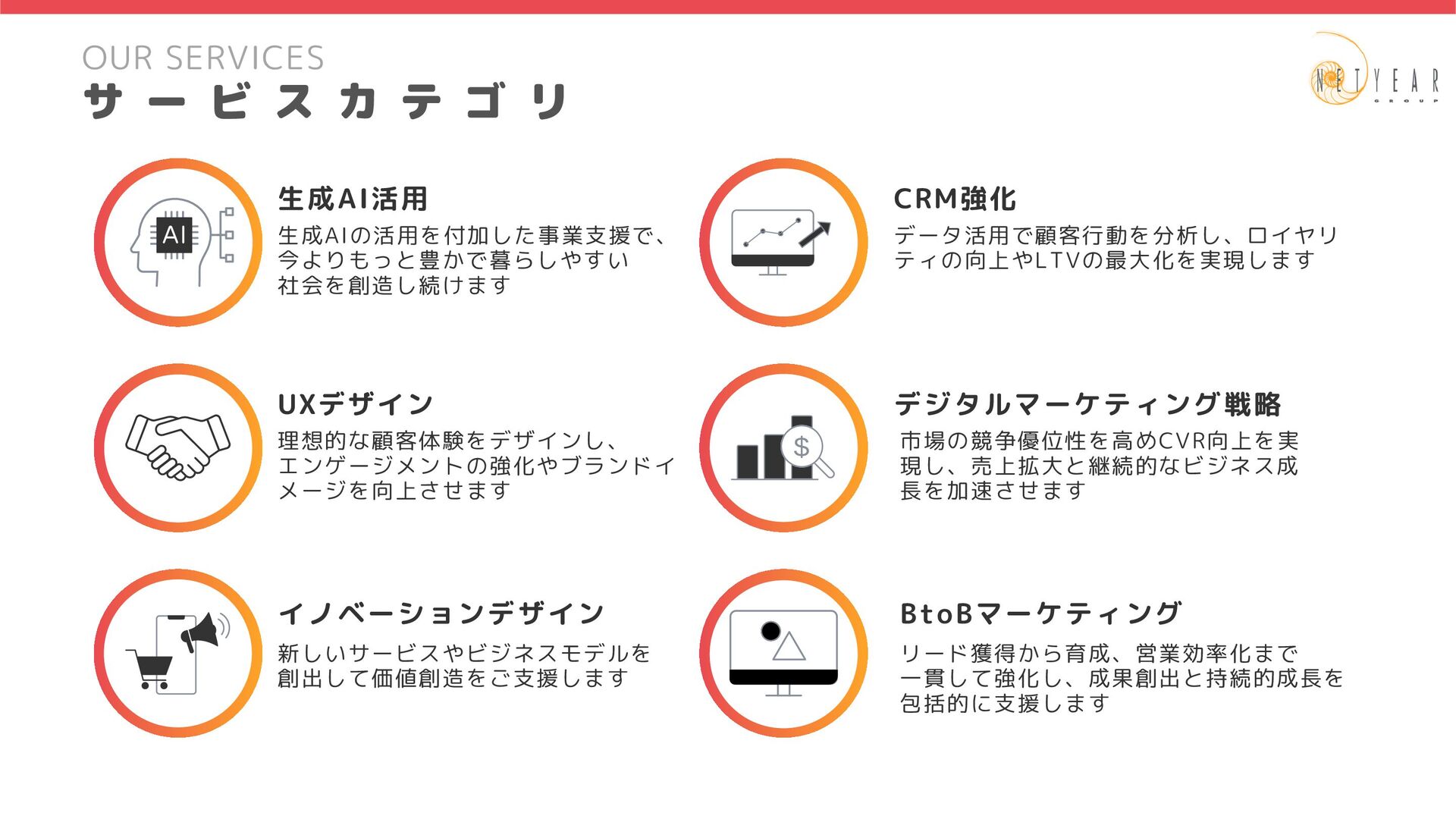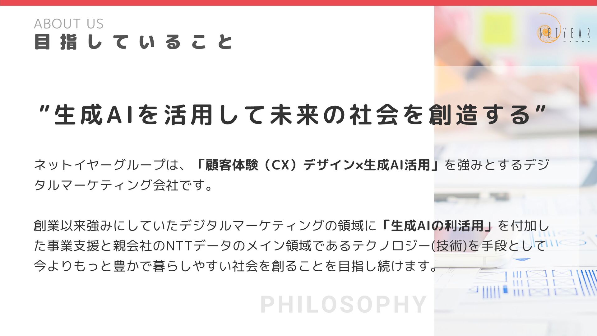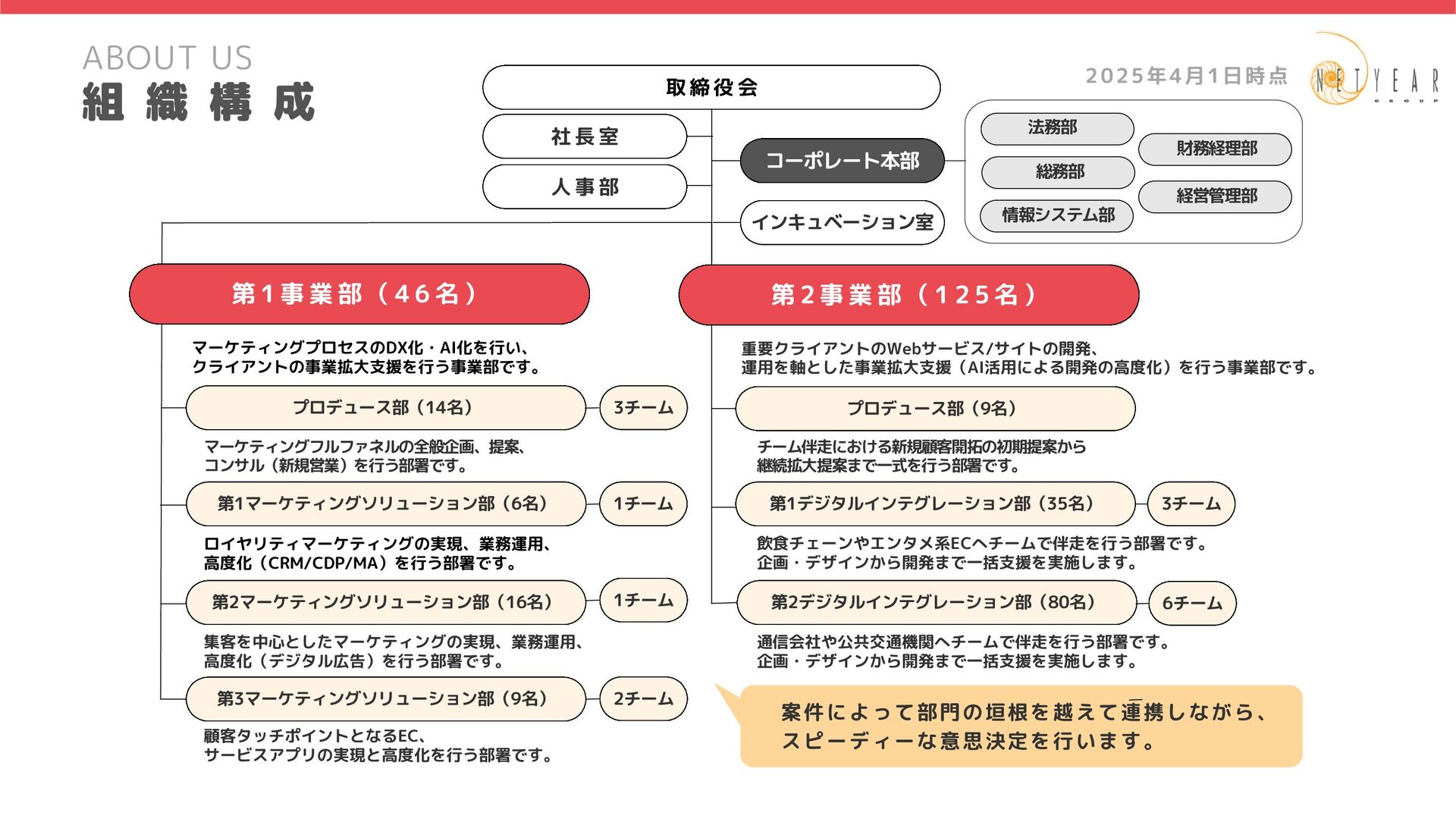 2025年4月1日時点 ロイヤリティマーケティングの実現、業務運用、 高度化(CRM/CDP/MA)を行う部署です。 マーケティングプロセスのDX化・AI化を行い、 クライアントの事業拡大支援を行う事業部です。 財務経理部 社 長 室 コーポレート本部 法務部 総務部 案件によって部門の垣根を越えて連携しながら、 スピーディーな意思決定を行います。 情報システム部 経営管理部 人 事 部 インキュベーション室 マーケティングフルファネルの全般企画、提案、 コンサル(新規営業)を行う部署です。 集客を中心としたマーケティングの実現、業務運用、 高度化(デジタル広告)を行う部署です。 顧客タッチポイントとなるEC、 サービスアプリの実現と高度化を行う部署です。 第1事業部(46名) 第 1 事 業 部 ( 4 6 名 ) プロデュース部(14名) 3チーム 第1マーケティングソリューション部(6名) 1チーム 第2マーケティングソリューション部(16名) 1チーム 第3マーケティングソリューション部(9名) 2チーム チーム伴走における新規顧客開拓の初期提案から 継続拡大提案まで一式を行う部署です。 飲食チェーンやエンタメ系ECへチームで伴走を行う部署です。 企画・デザインから開発まで一括支援を実施します。 通信会社や公共交通機関へチームで伴走を行う部署です。 企画・デザインから開発まで一括支援を実施します。 第1事業部(46名) 重要クライアントのWebサービス/サイトの開発、 運用を軸とした事業拡大支援(AI活用による開発の高度化)を行う事業部です。 第 2 事 業 部 ( 1 2 5 名 ) プロデュース部(9名) 第1デジタルインテグレーション部(35名) 第2デジタルインテグレーション部(80名) 3チーム 6チーム