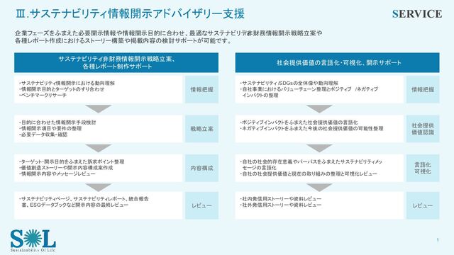 ・情報開示目的とターゲットのすり合わせ ・ベンチマークリサーチ 情報把握 ・目的に合わせた情報開示手段検討 ・情報開示項目や要件の整理 ・必要データ収集・確認 戦略立案 ・ターゲット・開示目的をふまえた訴求ポイント整理 ・価値創造ストーリーや開示内容構成案作成 ・情報開示内容やメッセージレビュー 内容構成 ・サステナビリティページ、サステナビリティレポート、統合報告 書、ESGデータブックなど開示内容の最終レビュー レビュー ・サステナビリティ /SDGsの全体像や動向理解 ・自社事業におけるバリューチェーン整理とポジティブ /ネガティブ インパクトの整理 情報把握 ・ポジティブインパクトをふまえた社会提供価値の言語化 ・ネガティブインパクトをふまえた今後の社会提供価値の可能性整理 社会提供 価値認識 ・自社の社会的存在意義やパーパスをふまえたサステナビリティメッ セージの言語化 ・自社の社会提供価値と現在の取り組みの整理と可視化レビュー 言語化 可視化 ・社内発信用ストーリーや資料レビュー ・社外発信用ストーリーや資料レビュー レビュー