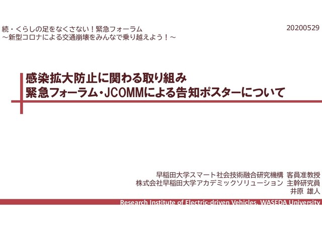 Research Institute of Electric-driven Vehicles, WASEDA University 感染拡大防止に関わる取り組み 緊急フォーラム・JCOMMによる告知ポスターについて 20200529