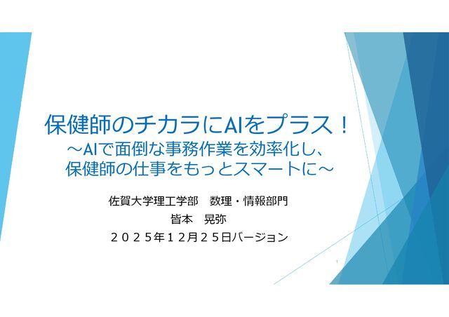 2025年12月25日に佐賀県看護協会 看護センターで実施した講演資料です。 「生成AIを基礎から知りたい」「業務にどう活かせばいいか分からない」という初心者の方に最適な入門編です。