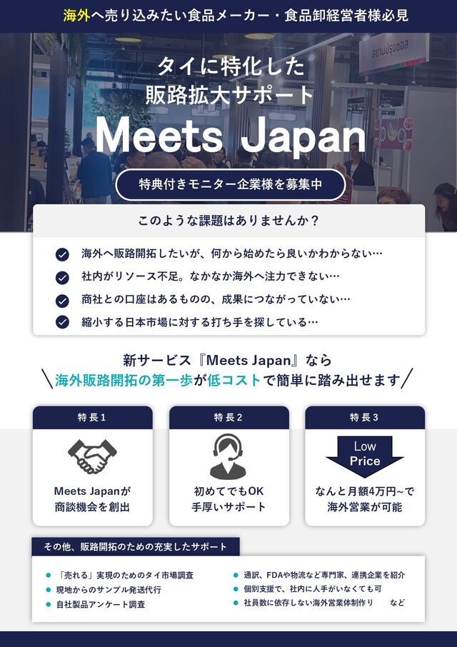 料金体系 初期費用 20万円(税別) ※ 初期費用はMeets JAPANの導入にかかる費用です。導入後はサービス利用料のみ発生します。 ※ サービス利用料はプランにより変動します。 ※ FDA取得や物流費など別途。 プラン C:個別伴走プラン 社内に担当ゼロの企業向け 30万円/月〜 ⚫ プランBサービス全て ⚫ 毎月のPDCA打ち合わせ ⚫ アンケート取得(3回) ⚫ LINE等でコミュニケーション プラン B:展示のみ 商品展示PRを行う企業向け 10万円/月〜 (冷凍の場合:12万円) ⚫ 専用区画をご用意 ⚫ イベント時のマッチングリク エスト ⚫ 施設からサンプルの発送代行 サービス利用料 4万円/月〜(税別) ⚫ 当該施設からのサンプル発送代行 ⚫ 競合・モデル商品の現地市場調査 ⚫ アンケート調査 ※ 企業様の状況、事情に沿ったプラン、メニューについては、無料面談をご利用いただき、お気軽にご相談ください。 その他、販路開拓をサポートする豊富なメニュー ⚫ プレミアム区画のご提供 ⚫ 営業資料の作成支援 ⚫ 営業用動画 ⚫ 現地食品表示ラベル案作成支援 ⚫ HPのタイ語変換 ⚫ 営業アプローチ代行 など ※ 先着4社限定でモニター企業様を募集いたします。 モニター企業様には特別条件にてサービスを提供させていただきます。 (モニター企業様はご面談の上、決定とさせていただきます。予めご了承ください。) モニター企業様を募集中 募集期間 2025年6月1日〜 ※期間は個別にて決定 対象 中小零細の食品メーカー、卸企業様 内容 特別条件、価格でのサービス提供 申込方法 担当:南口(ミナミグチ)までお問い 合わせください 規定数に到達次第、 終了とさせていただきます。 応募締め切り 先着 4社 さらに補助金などを賢く活用できれば、さらなる低コストで実施が可能に! 海外販路へご興味ある経営者様、経営陣様は、お気軽にご相談ください。 S T E P 3 S T E P 2 S T E P 1 弊社HPからのお問合せ、 もしくは下記メールアド レスよりご連絡ください。 個別のご面談 モニター決定