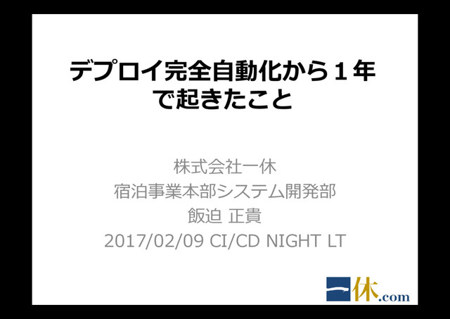 デプロイ完全自動化から1年 で起きたこと 株式会社一休 株式会社一休 宿泊事業本部システム開発部 飯迫 正貴 2017/02/09 CI/CD NIGHT