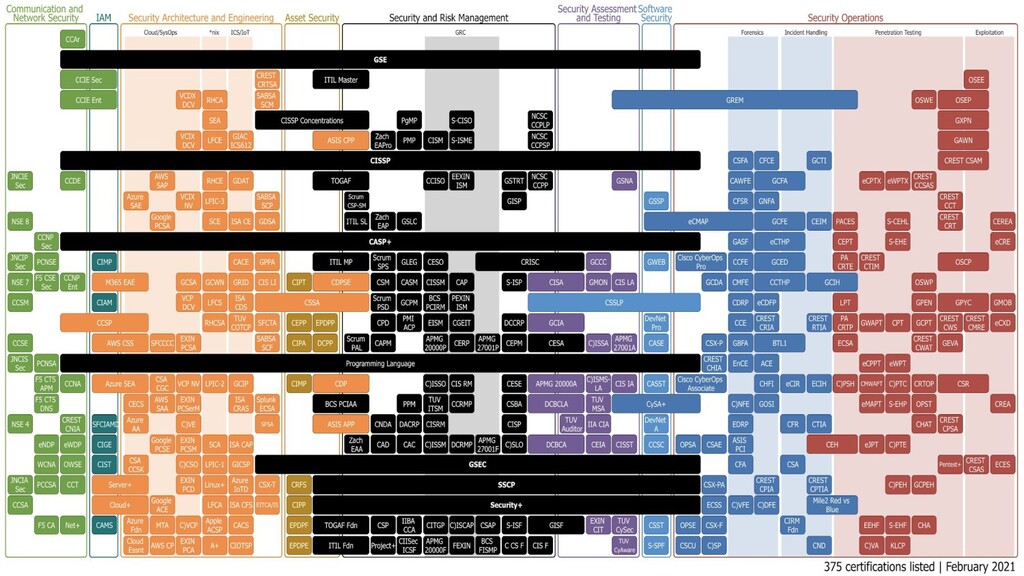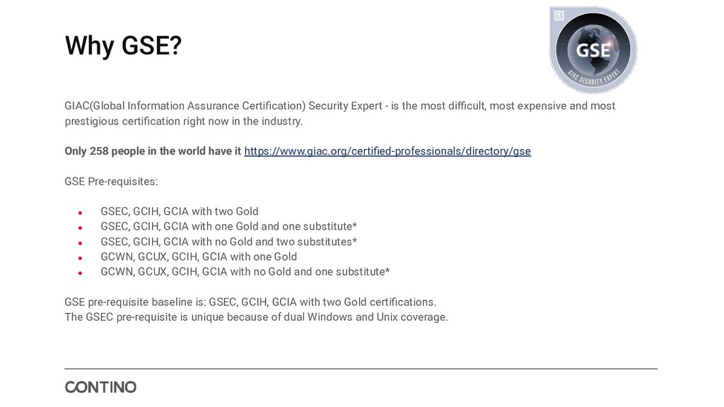 the most difficult, most expensive and most prestigious certification right now in the industry. Only 258 people in the world have it https://www.giac.org/certified-professionals/directory/gse GSE Pre-requisites: • GSEC, GCIH, GCIA with two Gold • GSEC, GCIH, GCIA with one Gold and one substitute* • GSEC, GCIH, GCIA with no Gold and two substitutes* • GCWN, GCUX, GCIH, GCIA with one Gold • GCWN, GCUX, GCIH, GCIA with no Gold and one substitute* GSE pre-requisite baseline is: GSEC, GCIH, GCIA with two Gold certifications. The GSEC pre-requisite is unique because of dual Windows and Unix coverage.