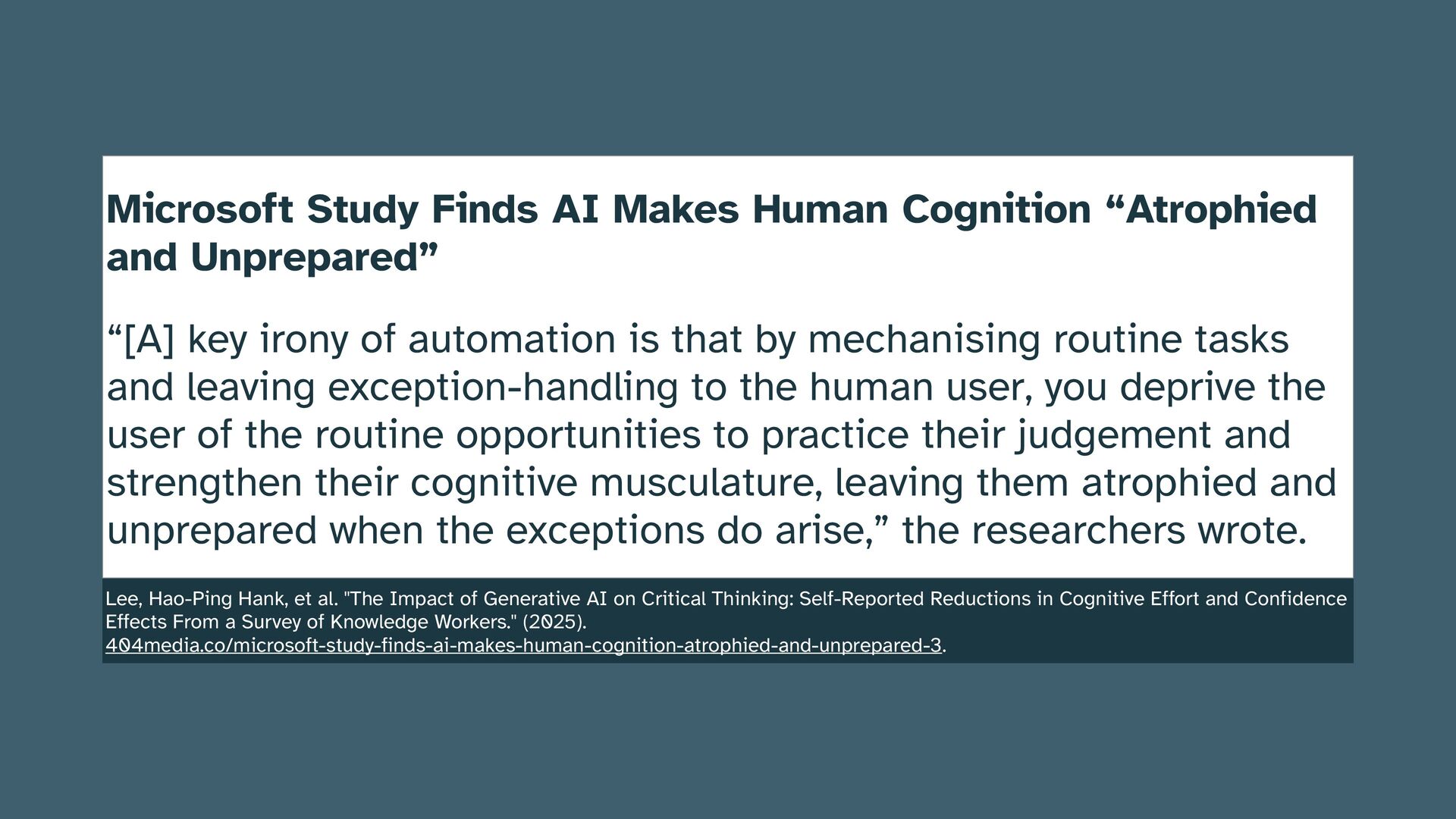 “[A] key irony of automation is that by mechanising routine tasks and leaving exception-handling to the human user, you deprive the user of the routine opportunities to practice their judgement and strengthen their cognitive musculature, leaving them atrophied and unprepared when the exceptions do arise,” the researchers wrote. Lee, Hao-Ping Hank, et al. "The Impact of Generative AI on Critical Thinking: Self-Reported Reductions in Cognitive Effort and Confidence Effects From a Survey of Knowledge Workers." (2025). 404media.co/microsoft-study-finds-ai-makes-human-cognition-atrophied-and-unprepared-3.