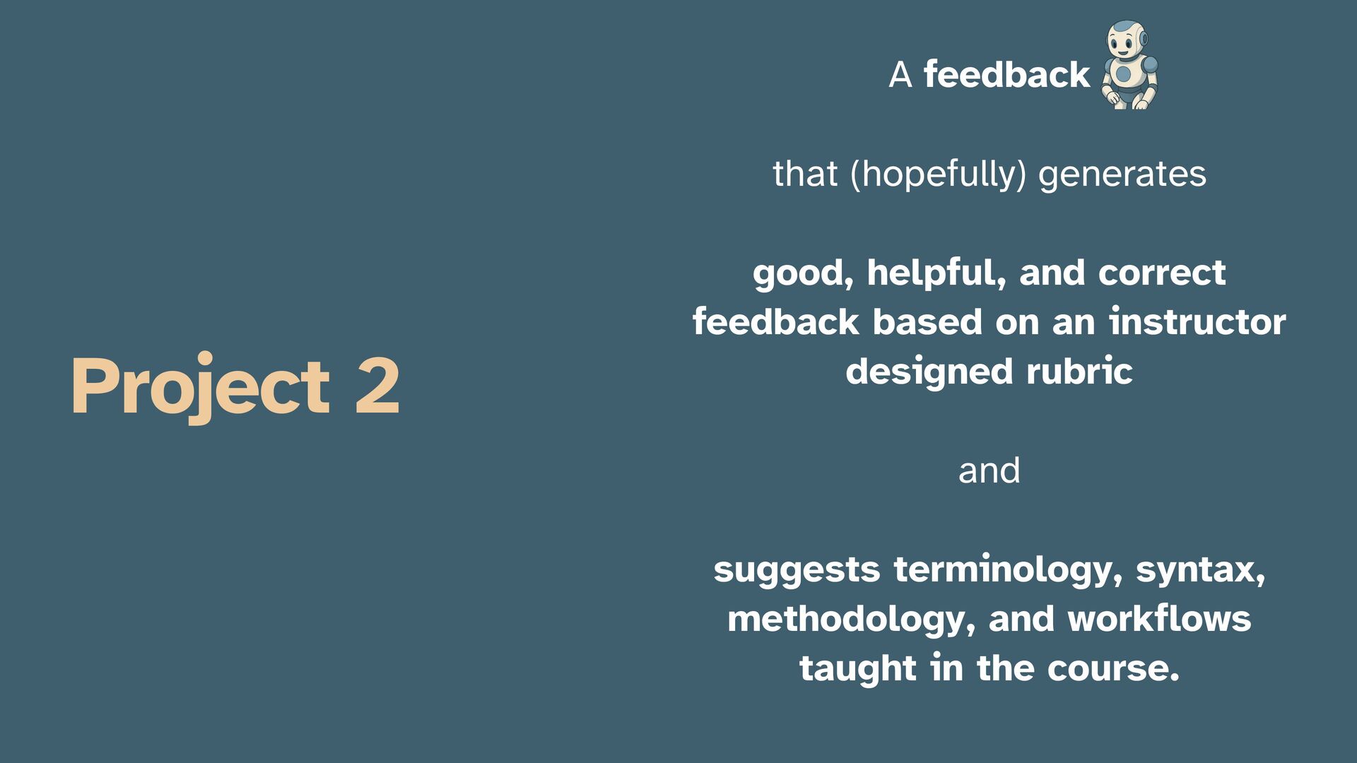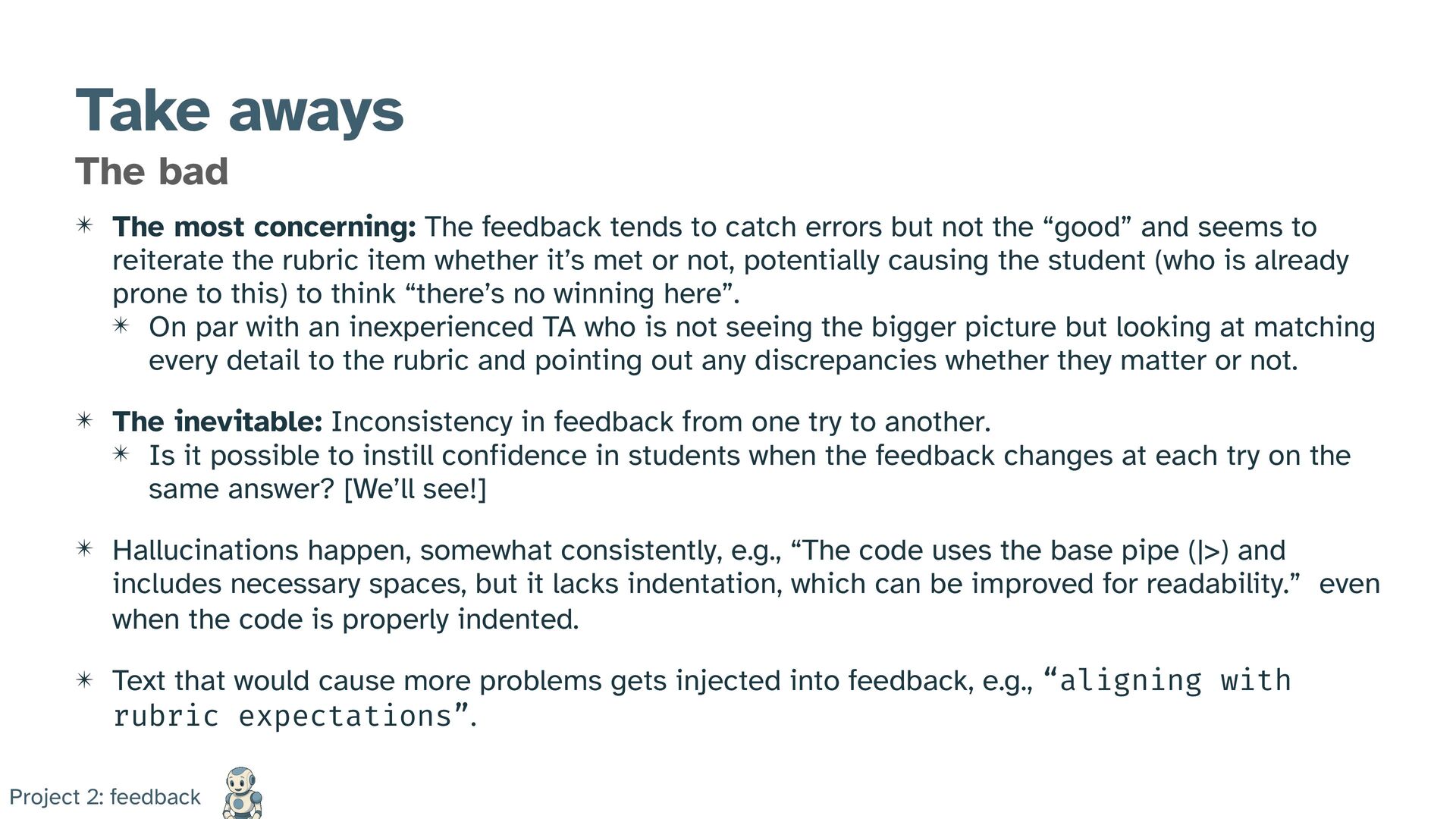 tends to catch errors but not the “good” and seems to reiterate the rubric item whether it’s met or not, potentially causing the student (who is already prone to this) to think “there’s no winning here”. ✴ On par with an inexperienced TA who is not seeing the bigger picture but looking at matching every detail to the rubric and pointing out any discrepancies whether they matter or not. ✴ The inevitable: Inconsistency in feedback from one try to another. ✴ Is it possible to instill confidence in students when the feedback changes at each try on the same answer? [We’ll see!] ✴ Hallucinations happen, somewhat consistently, e.g., “The code uses the base pipe (|>) and includes necessary spaces, but it lacks indentation, which can be improved for readability.” even when the code is properly indented. ✴ Text that would cause more problems gets injected into feedback, e.g., “aligning with rubric expectations”. Project 2: feedback
