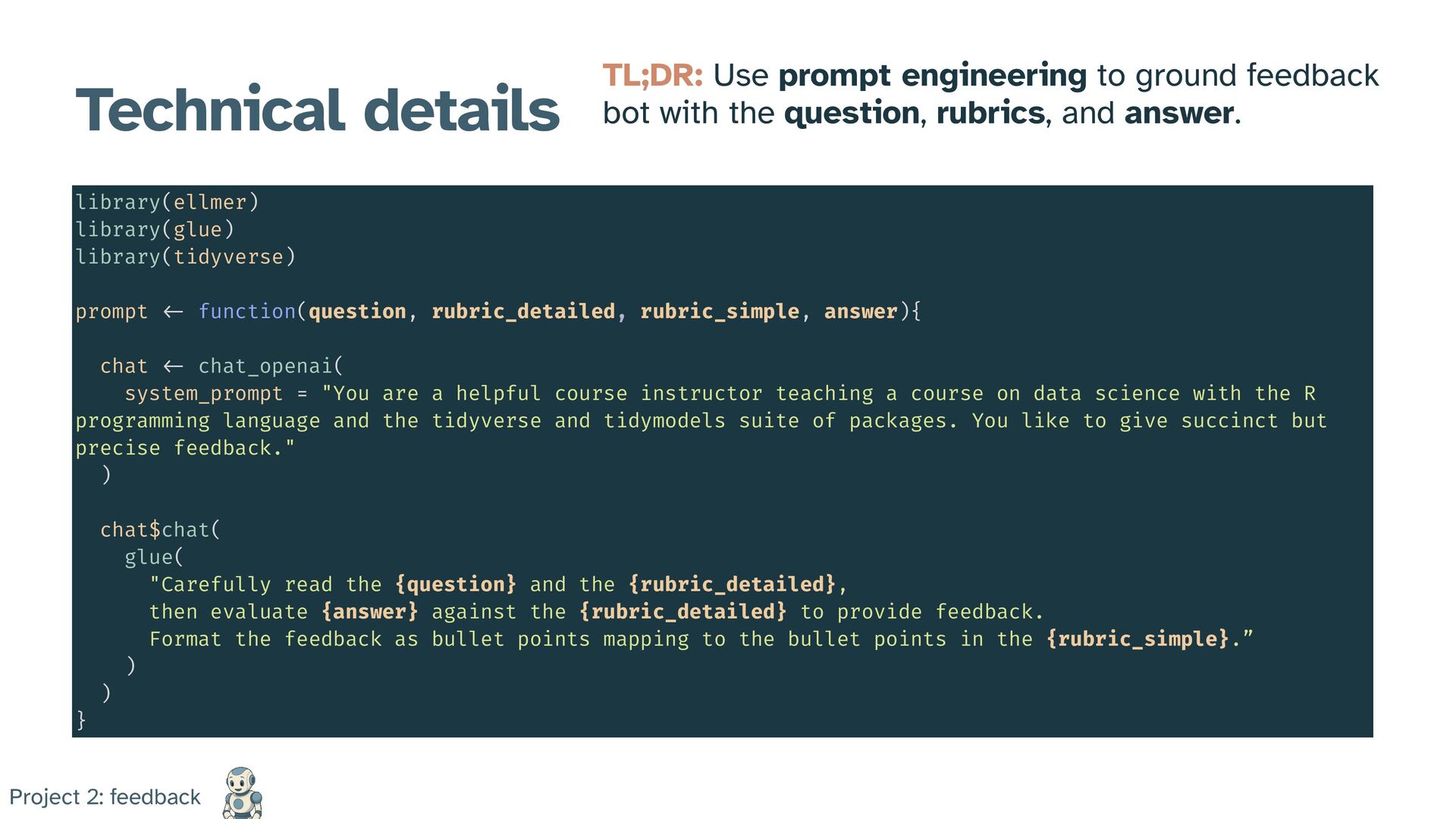 with the question, rubrics, and answer. library(ellmer) library(glue) library(tidyverse) prompt < - function(question, rubric_detailed, rubric_simple, answer){ chat < - chat_openai( system_prompt = "You are a helpful course instructor teaching a course on data science with the R programming language and the tidyverse and tidymodels suite of packages. You like to give succinct but precise feedback." ) chat$chat( glue( "Carefully read the {question} and the {rubric_detailed}, then evaluate {answer} against the {rubric_detailed} to provide feedback. Format the feedback as bullet points mapping to the bullet points in the {rubric_simple}.” ) ) } Project 2: feedback