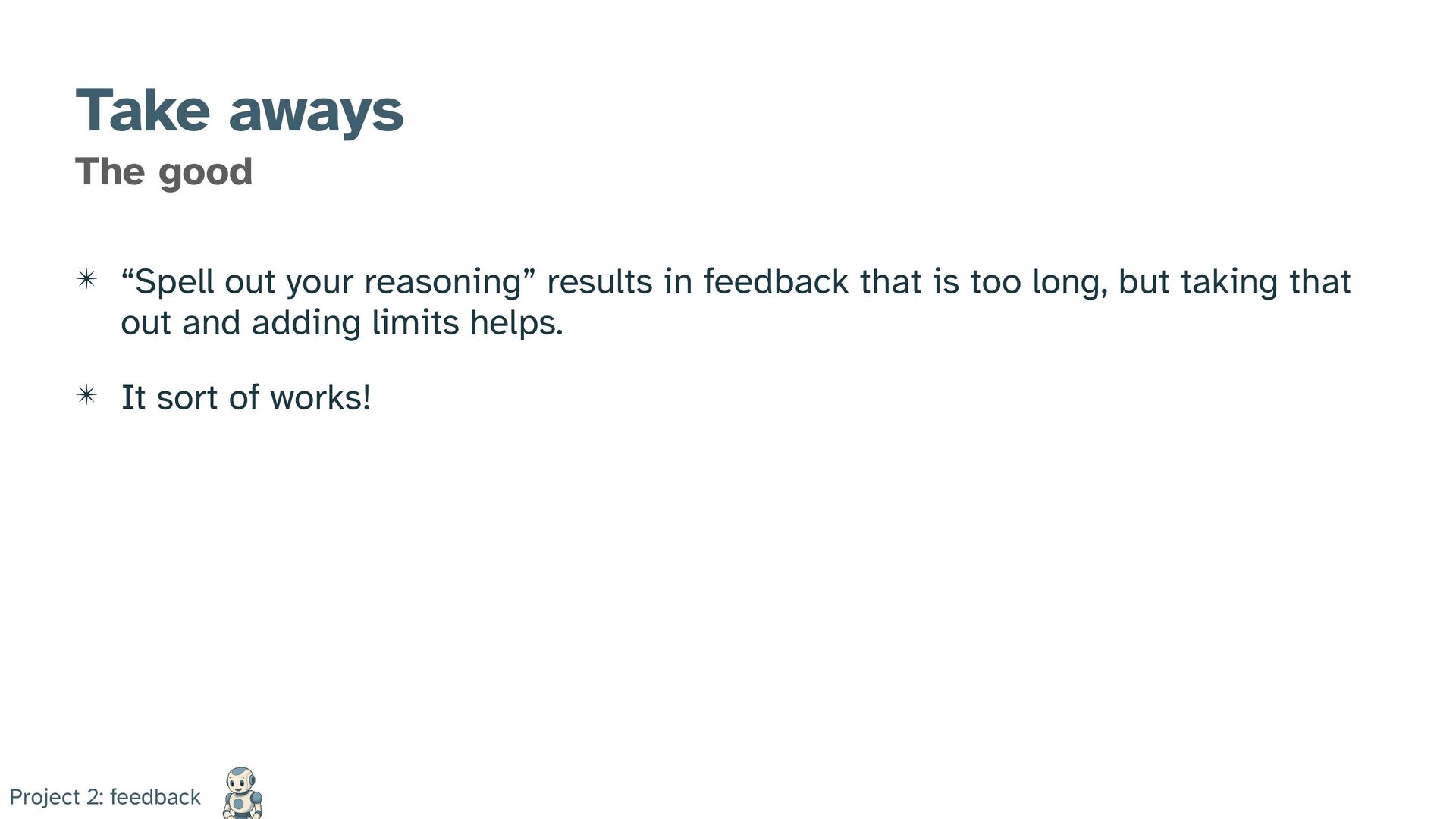 in feedback that is too long, but taking that out and adding limits helps. ✴ It sort of works! Project 2: feedback