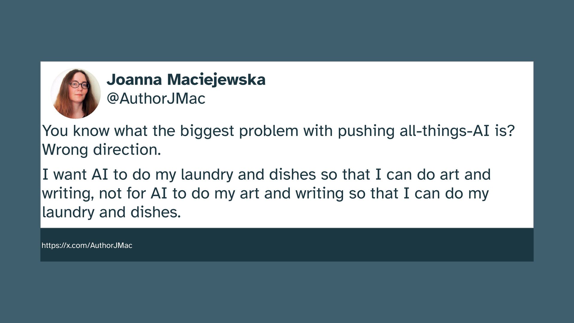 pushing all-things-AI is? Wrong direction. I want AI to do my laundry and dishes so that I can do art and writing, not for AI to do my art and writing so that I can do my laundry and dishes. https://x.com/AuthorJMac