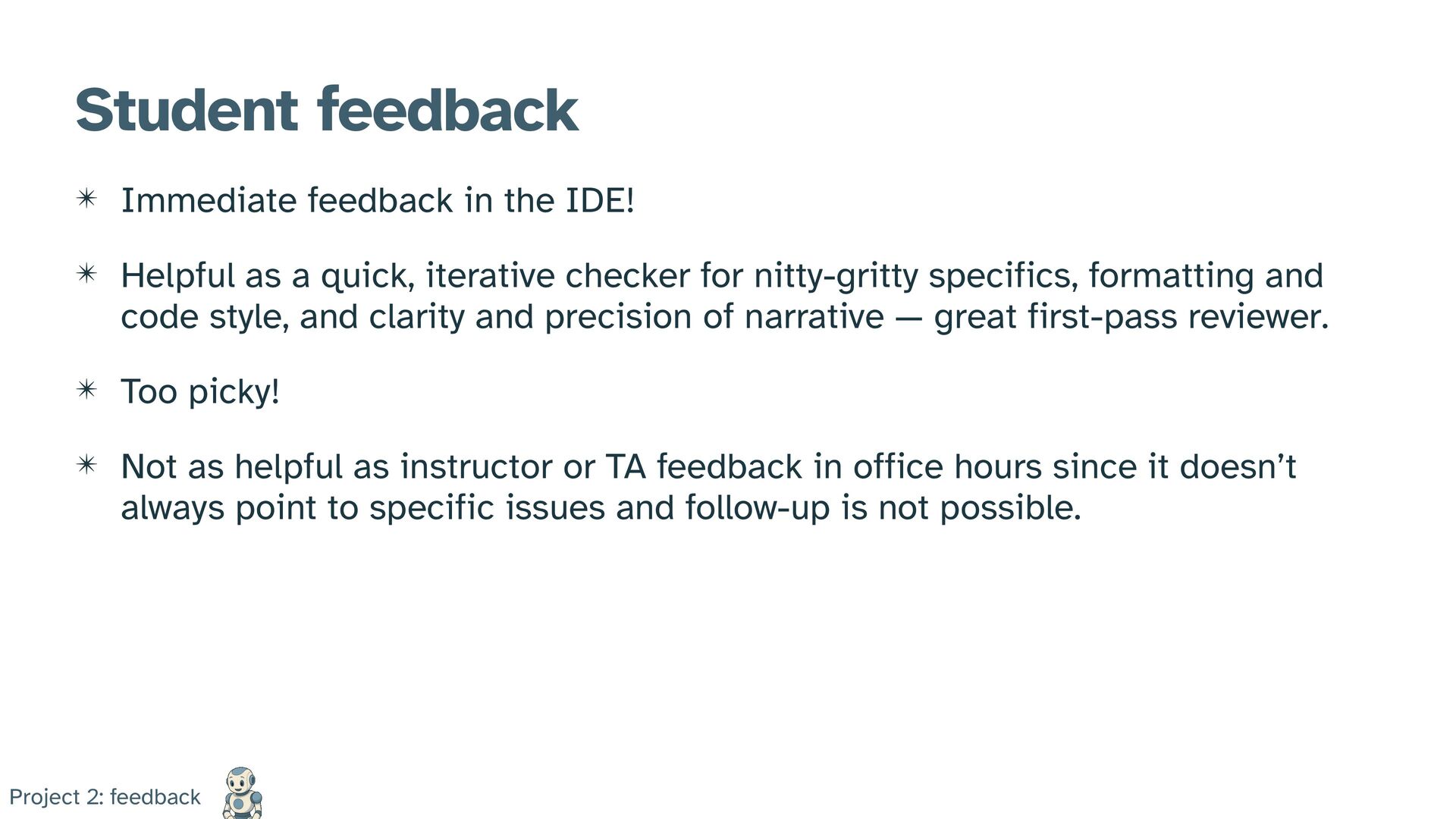 IDE! ✴ Helpful as a quick, iterative checker for nitty-gritty specifics, formatting and code style, and clarity and precision of narrative — great first-pass reviewer. ✴ Too picky! ✴ Not as helpful as instructor or TA feedback in office hours since it doesn’t always point to specific issues and follow-up is not possible.