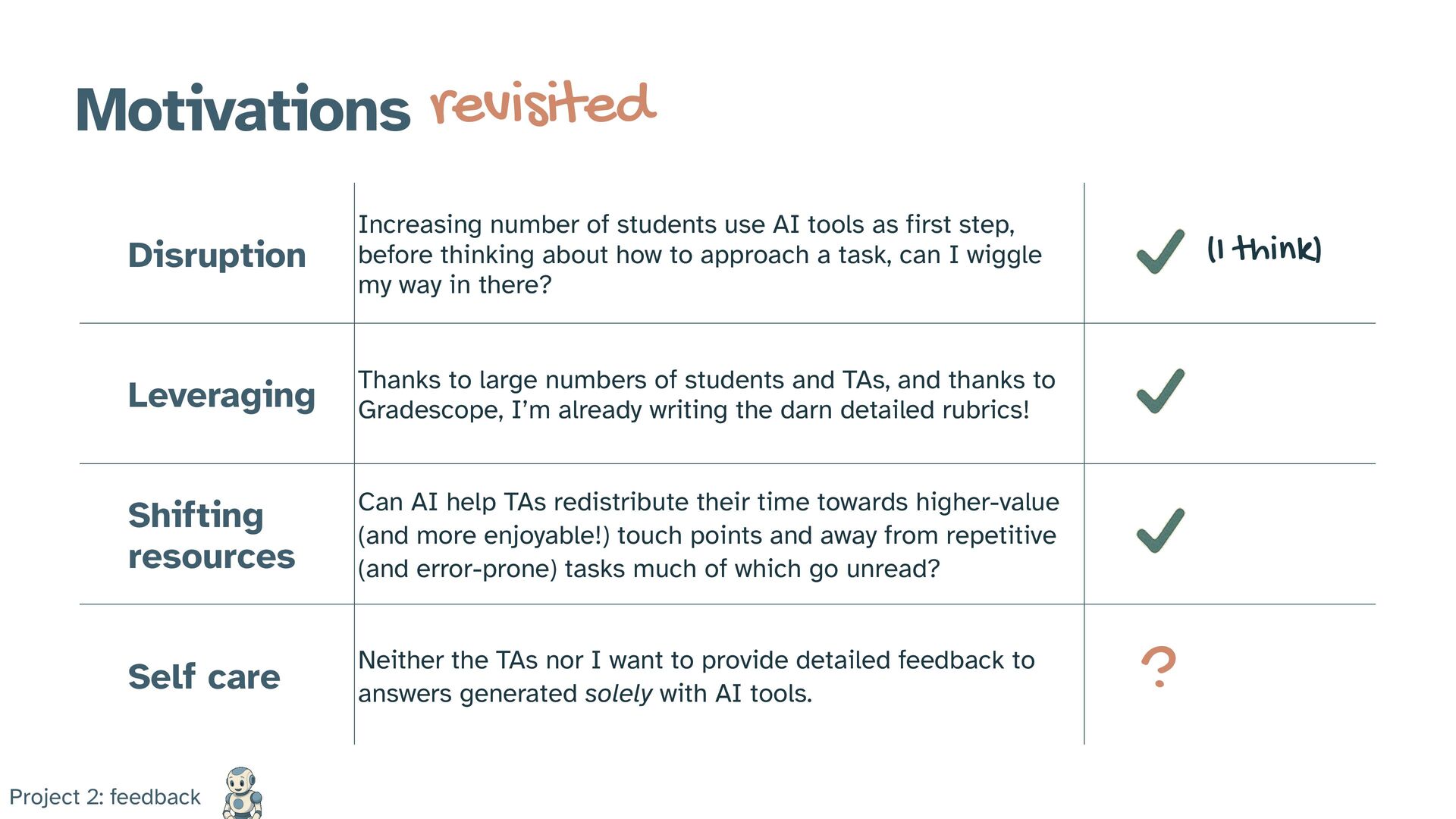 AI tools as first step, before thinking about how to approach a task, can I wiggle my way in there? Leveraging Thanks to large numbers of students and TAs, and thanks to Gradescope, I’m already writing the darn detailed rubrics! Shifting resources Can AI help TAs redistribute their time towards higher-value (and more enjoyable!) touch points and away from repetitive (and error-prone) tasks much of which go unread? Self care Neither the TAs nor I want to provide detailed feedback to answers generated solely with AI tools. (I think) ? revisited
