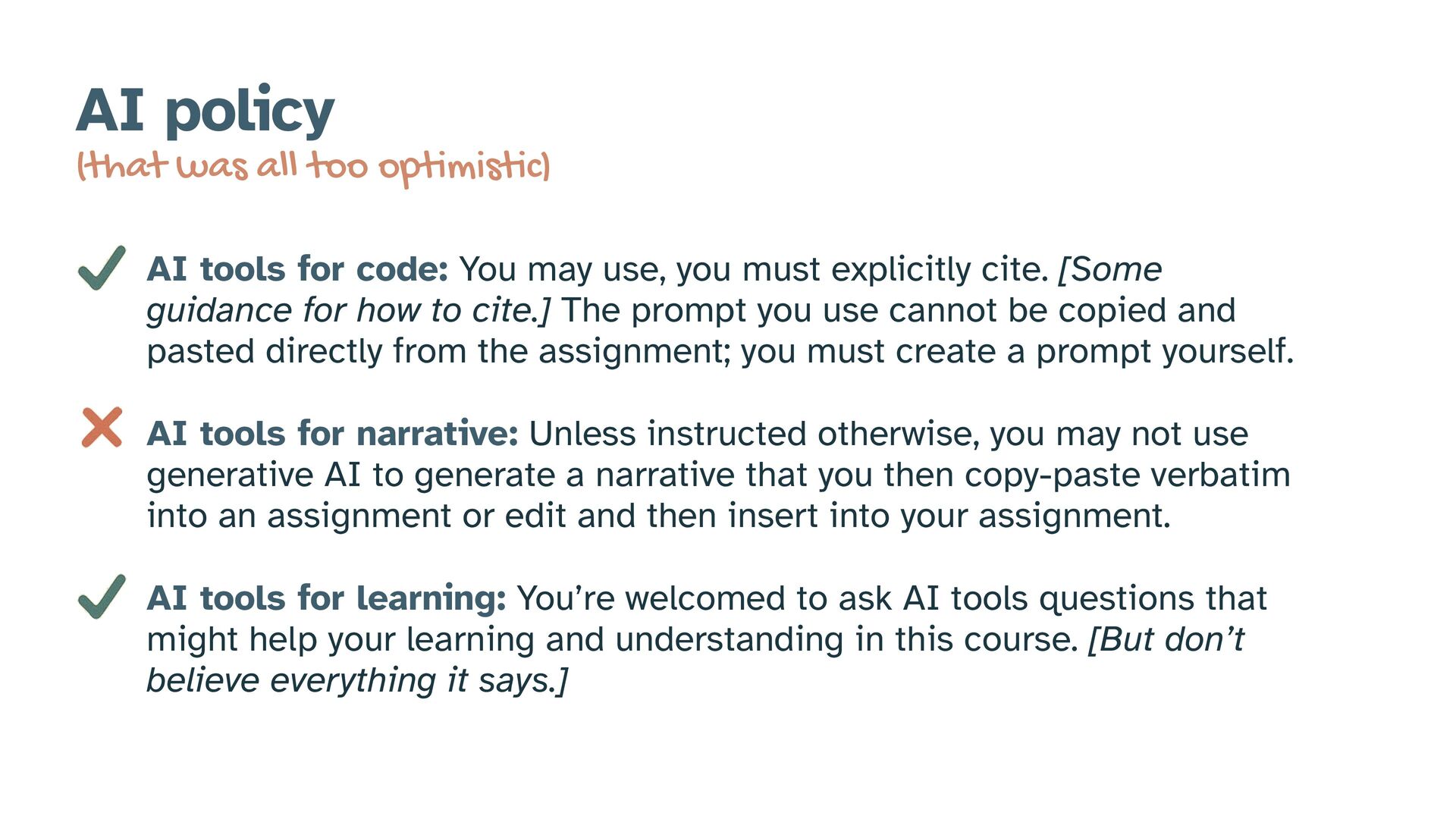 code: You may use, you must explicitly cite. [Some guidance for how to cite.] The prompt you use cannot be copied and pasted directly from the assignment; you must create a prompt yourself. AI tools for narrative: Unless instructed otherwise, you may not use generative AI to generate a narrative that you then copy-paste verbatim into an assignment or edit and then insert into your assignment. AI tools for learning: You’re welcomed to ask AI tools questions that might help your learning and understanding in this course. [But don’t believe everything it says.]