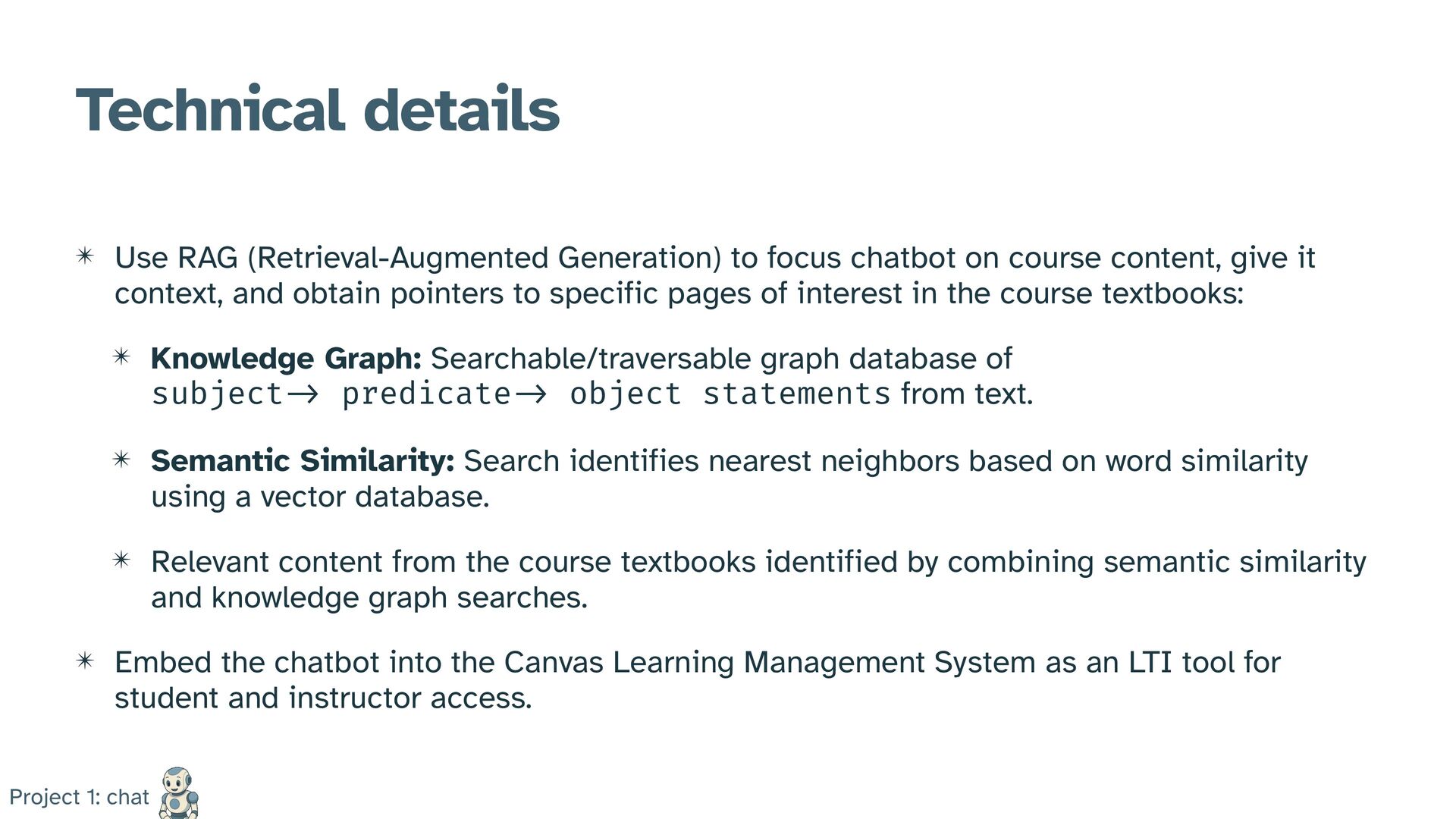 on course content, give it context, and obtain pointers to specific pages of interest in the course textbooks: ✴ Knowledge Graph: Searchable/traversable graph database of subject - > predicate - > object statements from text. ✴ Semantic Similarity: Search identifies nearest neighbors based on word similarity using a vector database. ✴ Relevant content from the course textbooks identified by combining semantic similarity and knowledge graph searches. ✴ Embed the chatbot into the Canvas Learning Management System as an LTI tool for student and instructor access. Project 1: chat