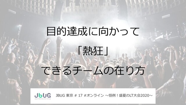 目的達成に向かって 「熱狂」 できるチームの在り方 JBUG 東京 # 17 #オンライン 〜恒例!盛夏のLT大会2020〜