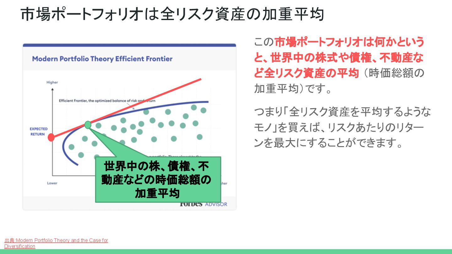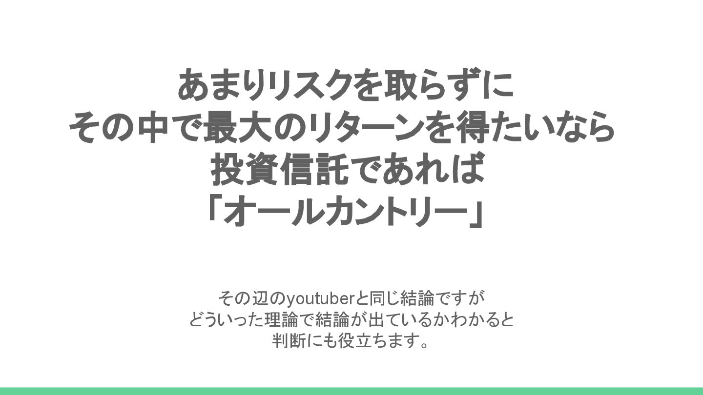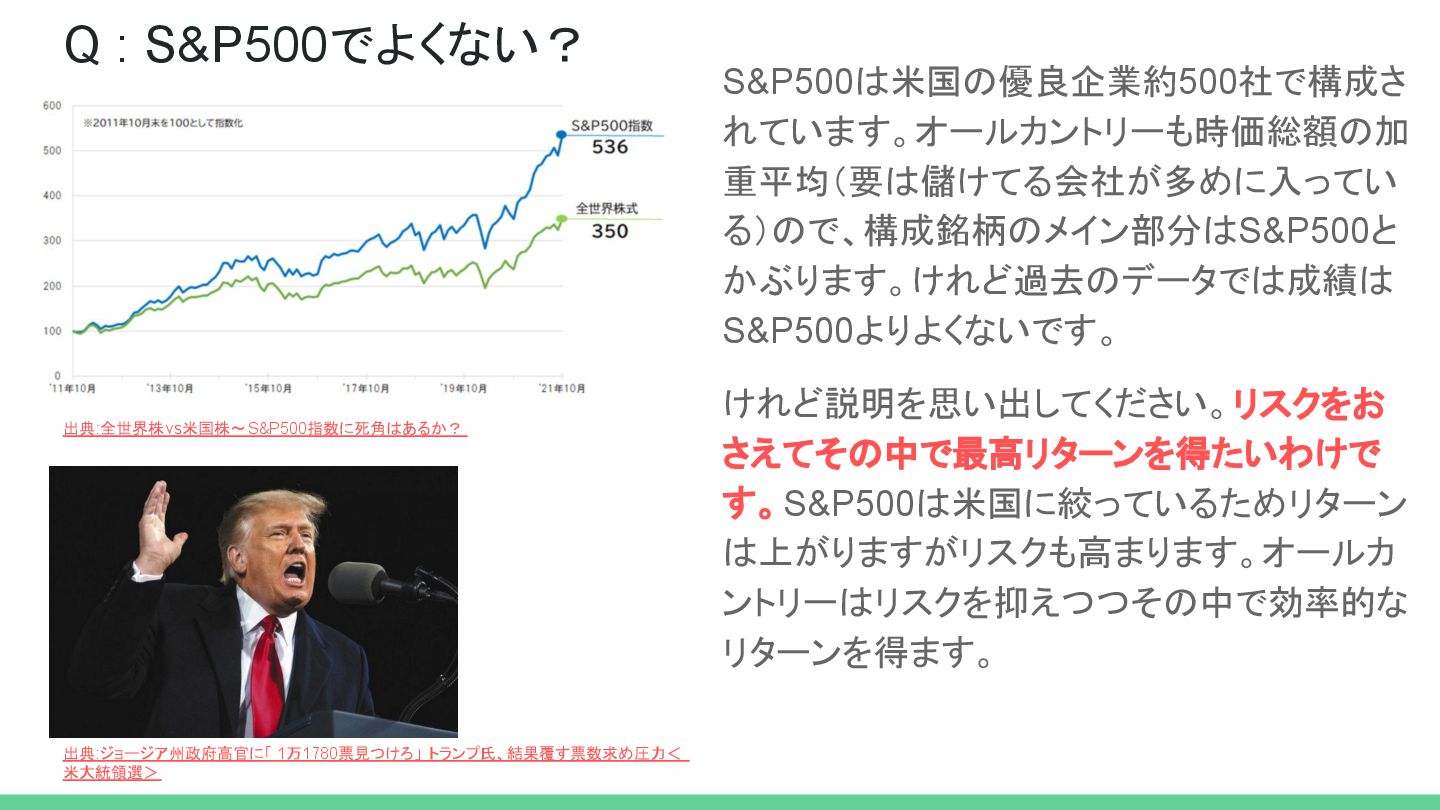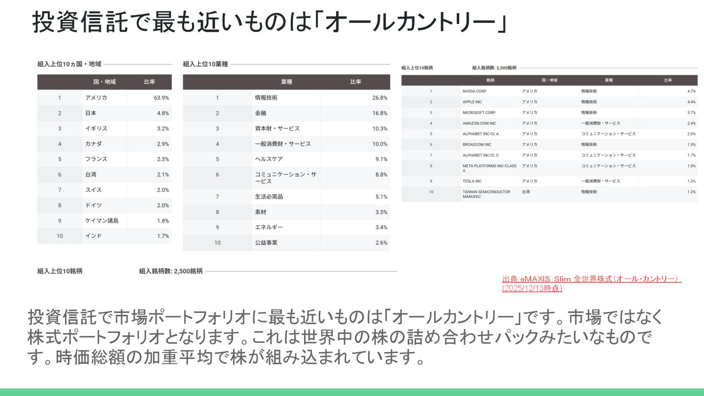 最後に、市場ポートフォリオに近い投資商品として、時価総額加重型の**全世界株式(オールカントリー)**を取り上げ、S&P500との違いや選択のポイントも説明します。