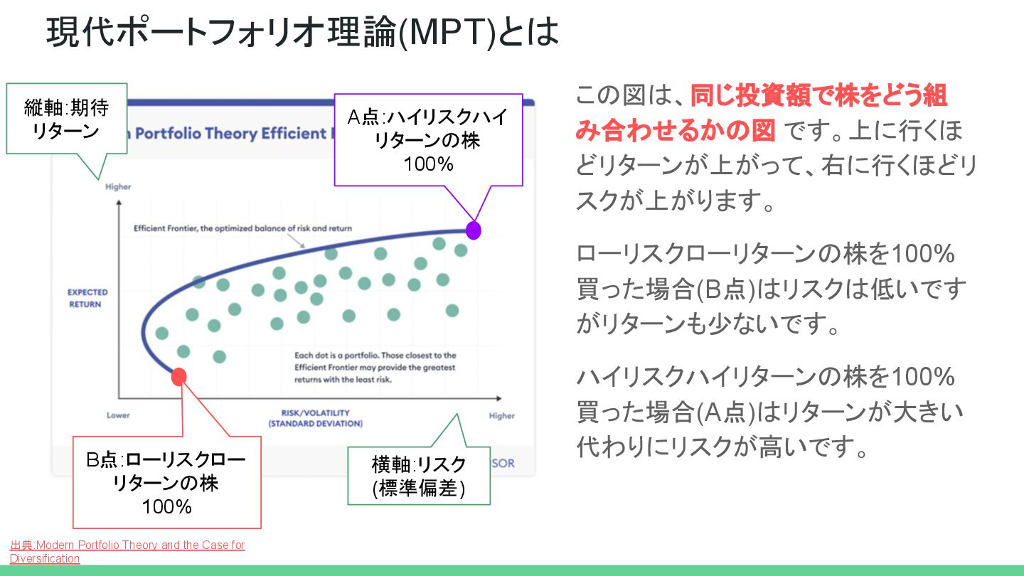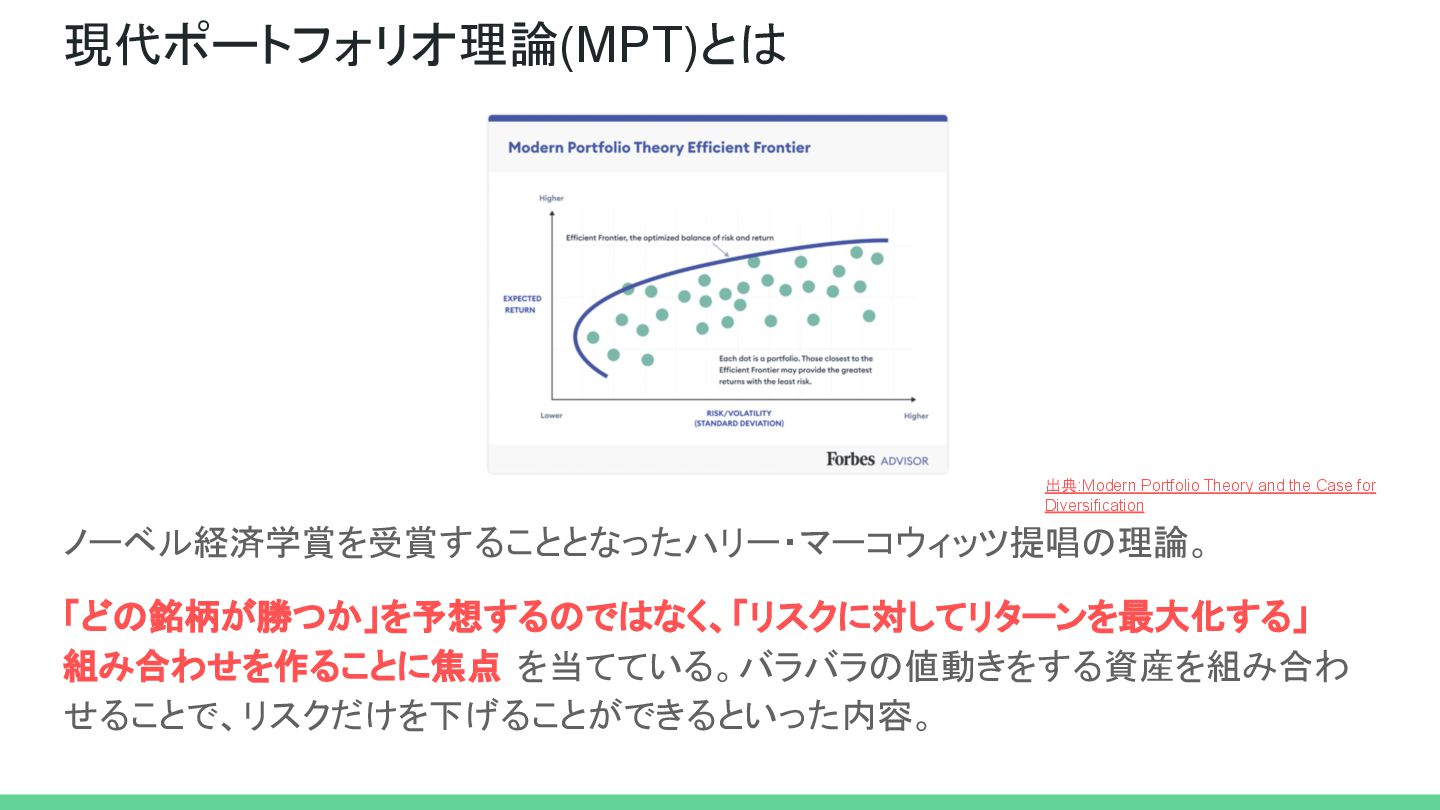 この資料では、**現代ポートフォリオ理論(MPT)**を基礎から分かりやすく解説し、投資においてリスクを抑えながら効率的にリターンを得る方法を紹介します。