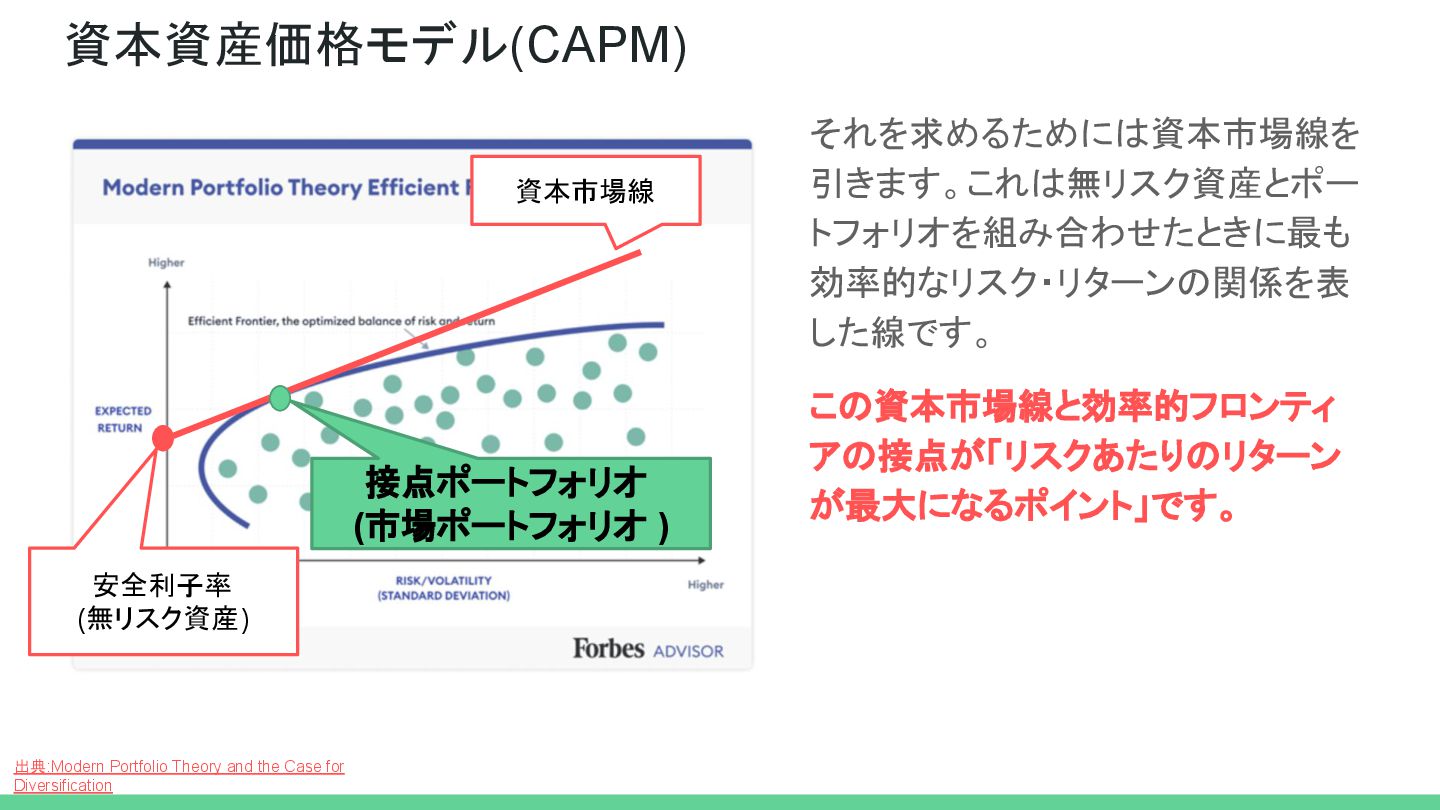 さらに、無リスク資産と効率的フロンティアの接点から導かれる**資本市場線(CML)と接点ポートフォリオ(市場ポートフォリオ)**を紹介し、理論的に最も効率的なポートフォリオとは何かを解説します。