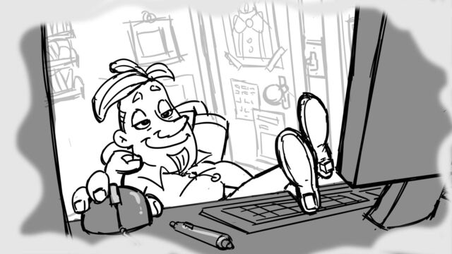 A series of 9 beats according to a given script about a storyboard artist's daily routine of chasing deadlines and getting yelled at by his production manager.