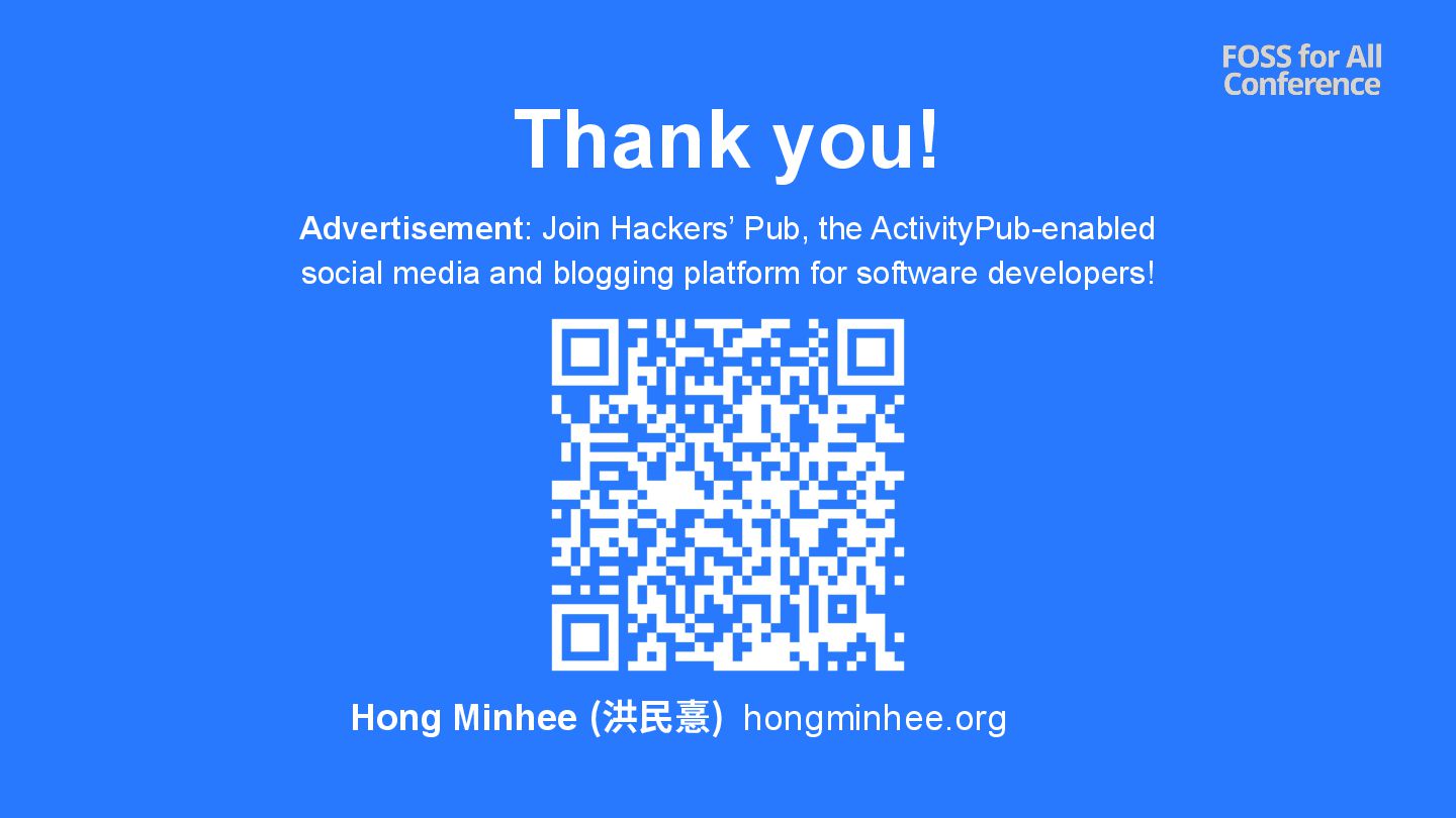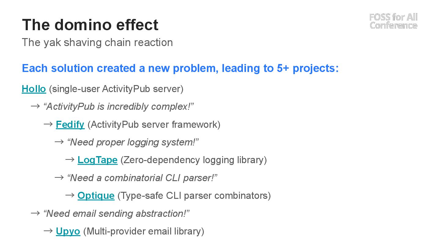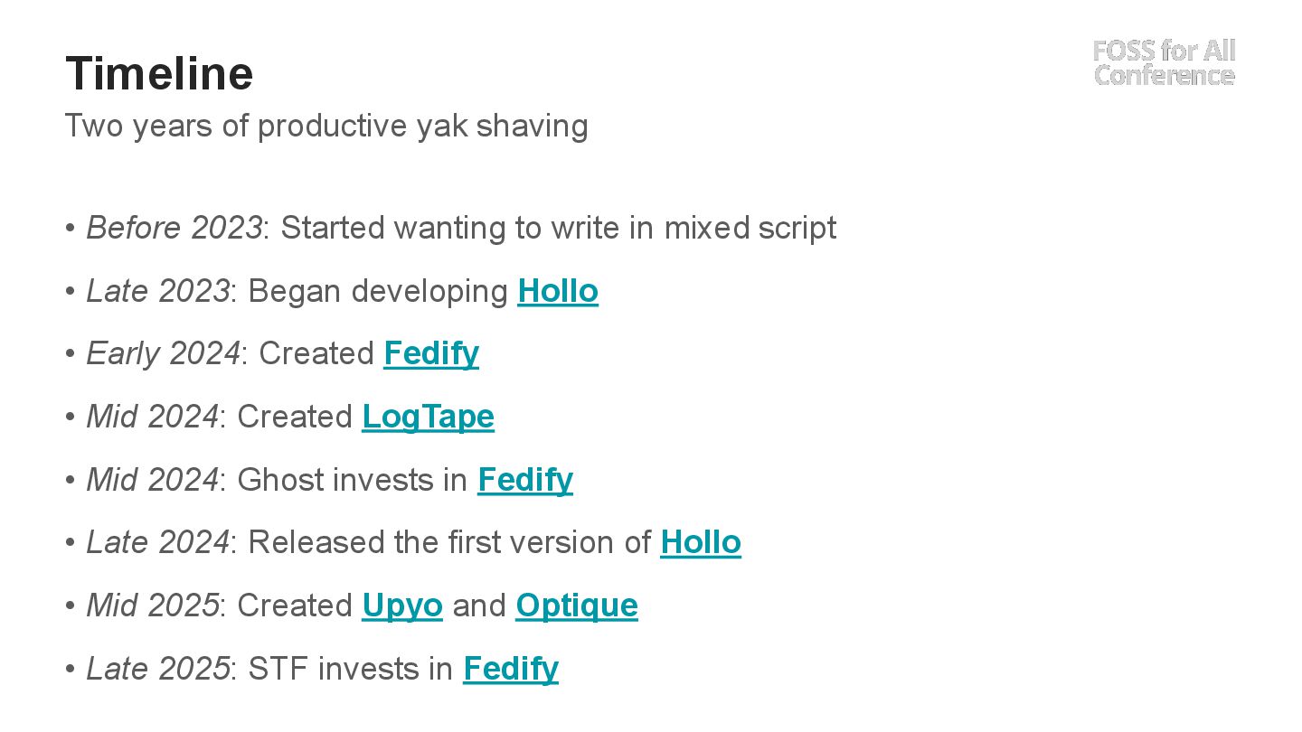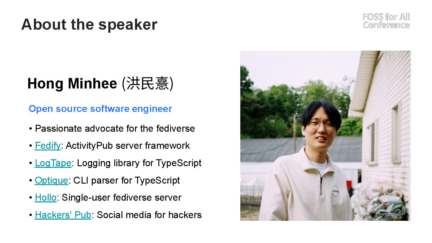 The speaker, Minhee Hong, is an avid supporter of the fediverse, a decentralized social network. To fix personal inconveniences they encountered while using the fediverse, they started a chain reaction of creating several open source projects two years ago, including Hollo, Fedify, LogTape, Hackers' Pub, Upyo, Optique, and BotKit. What began as an attempt to solve a very minor inconvenience gradually resulted in the creation of various byproducts.