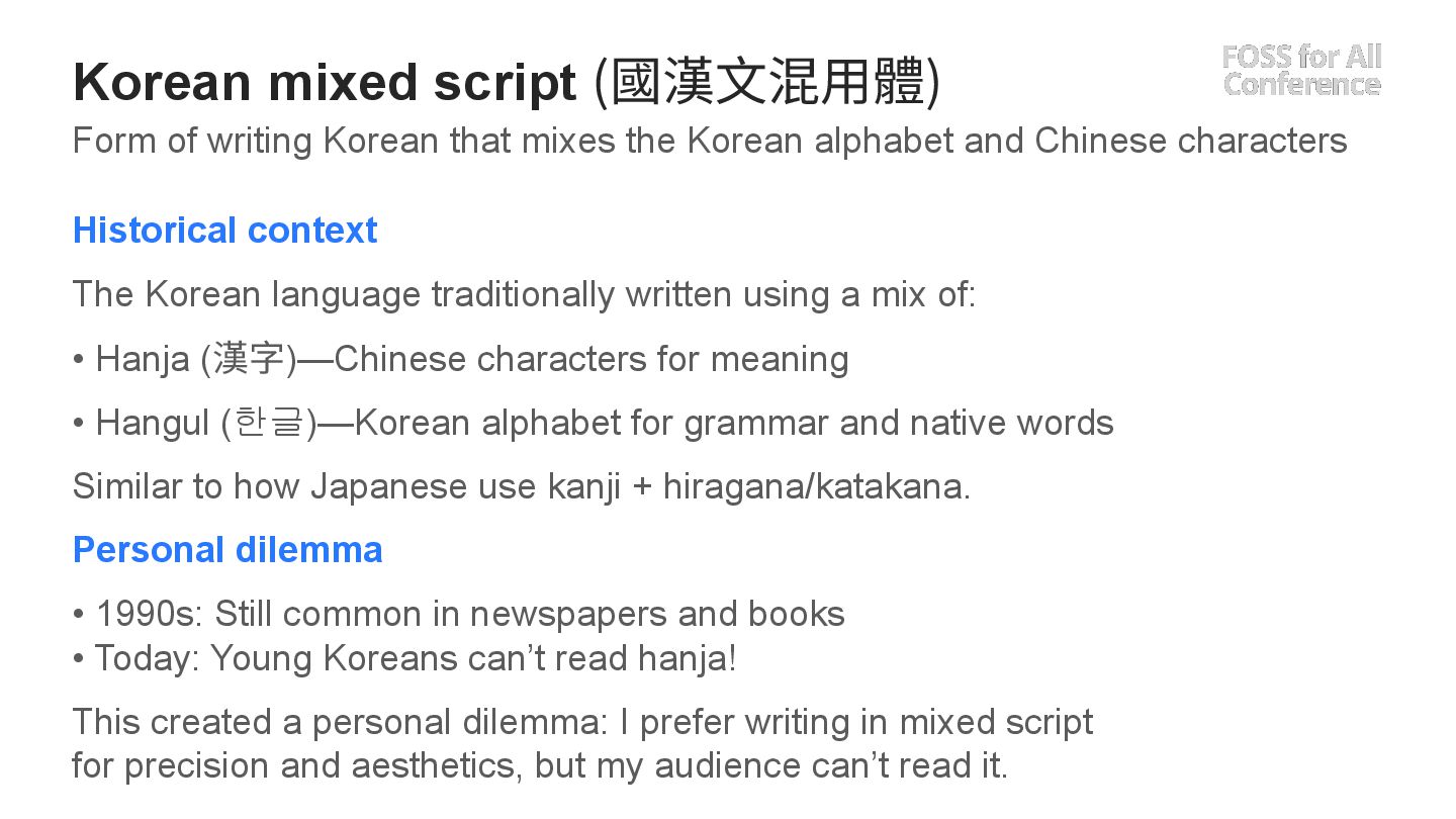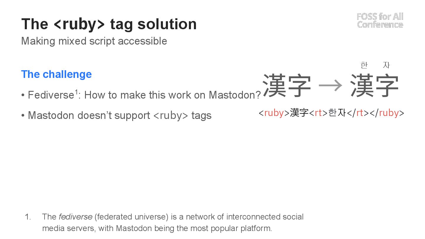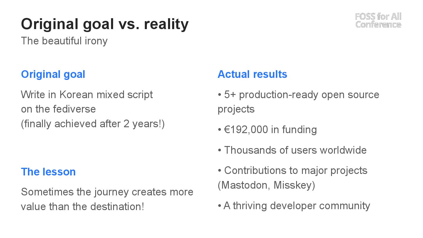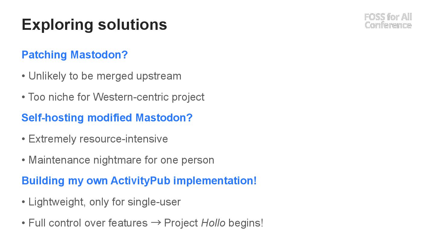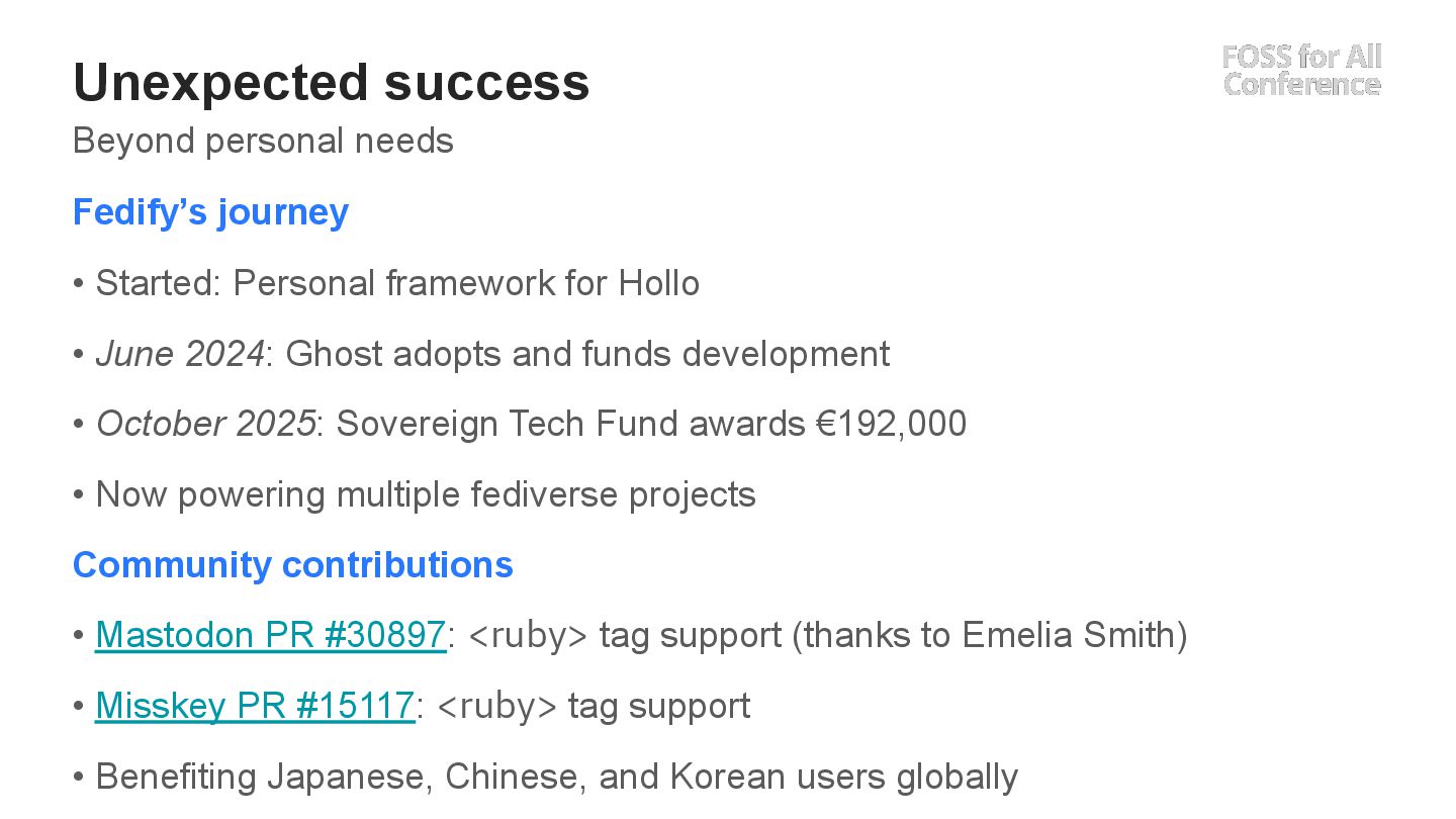 The speaker, Minhee Hong, is an avid supporter of the fediverse, a decentralized social network. To fix personal inconveniences they encountered while using the fediverse, they started a chain reaction of creating several open source projects two years ago, including Hollo, Fedify, LogTape, Hackers' Pub, Upyo, Optique, and BotKit. What began as an attempt to solve a very minor inconvenience gradually resulted in the creation of various byproducts.