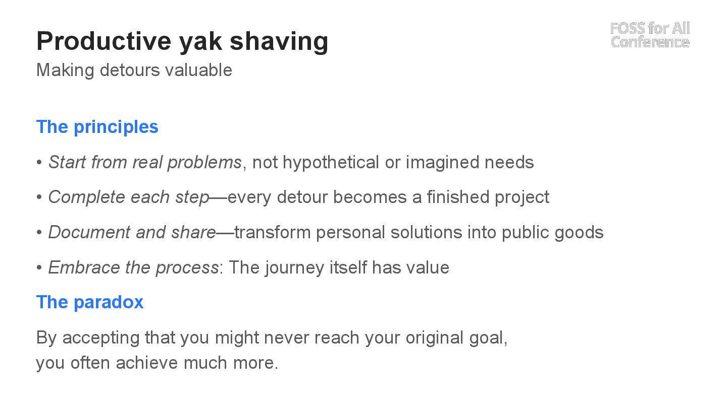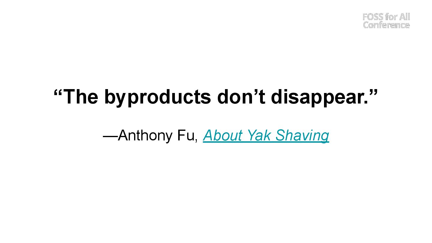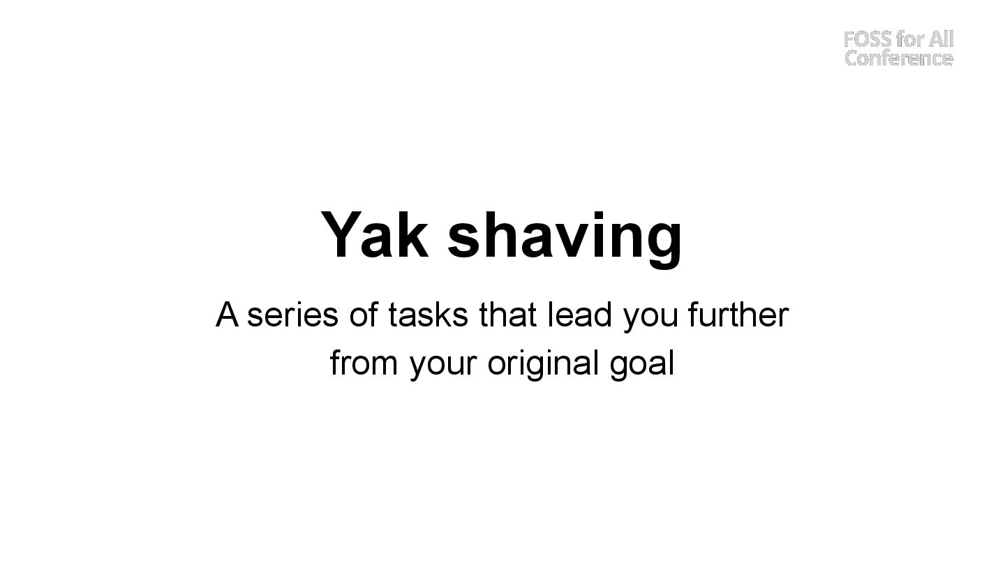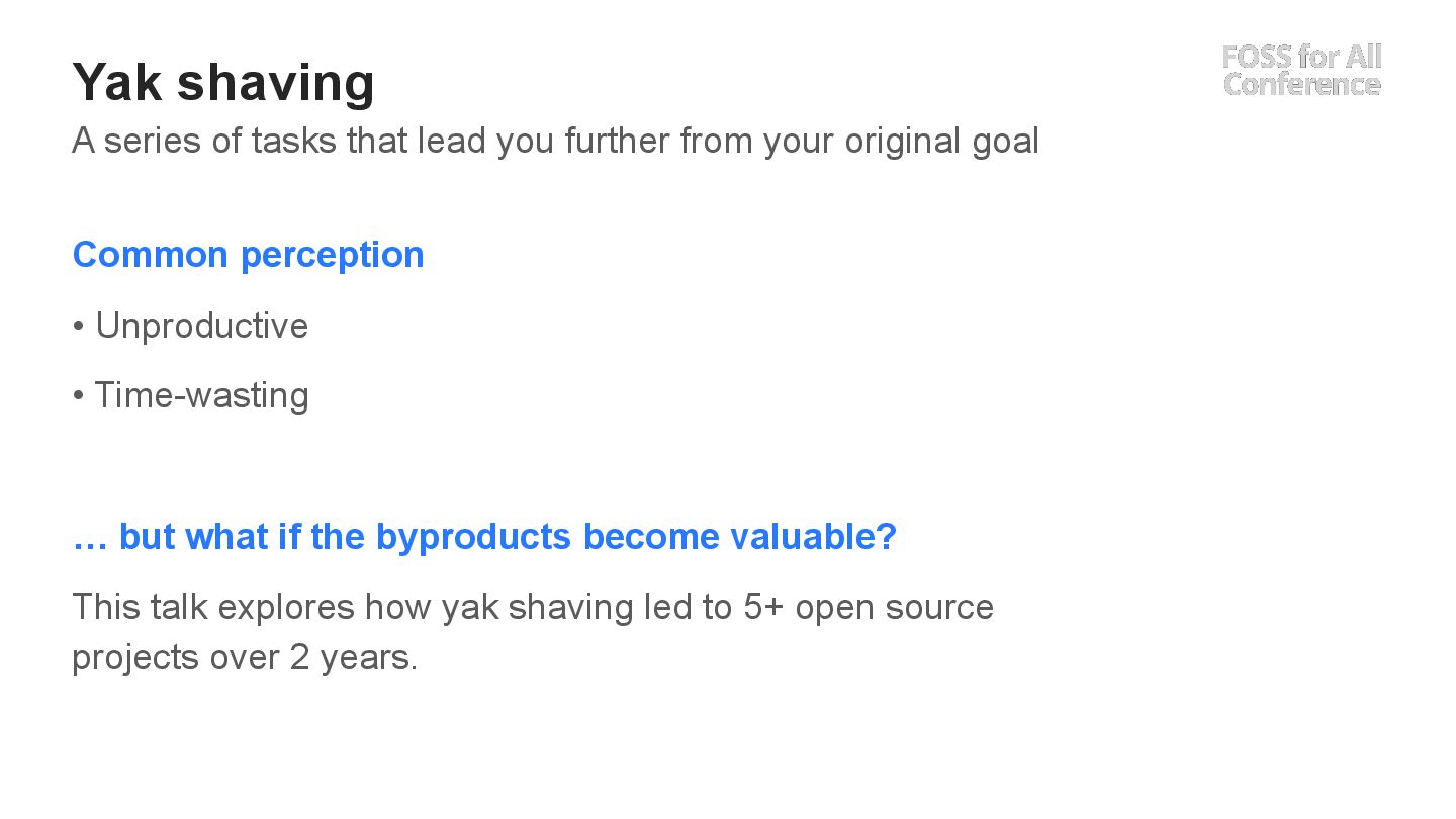 In this talk, the speaker reflects on the past two years to discuss the yak shaving spirit that became the driving force for numerous new open source projects, and will make the case that this approach can work for others as well.