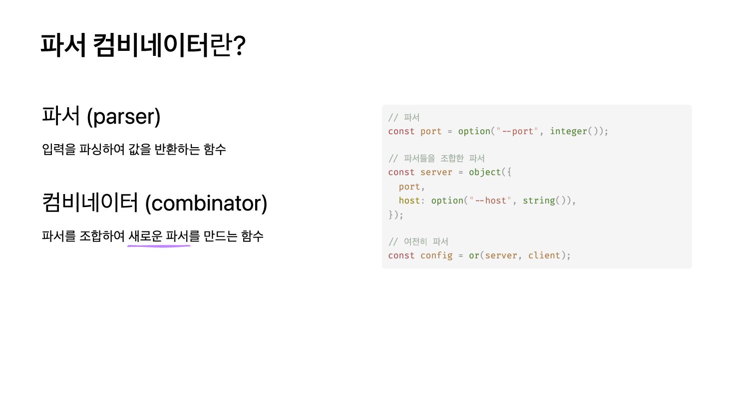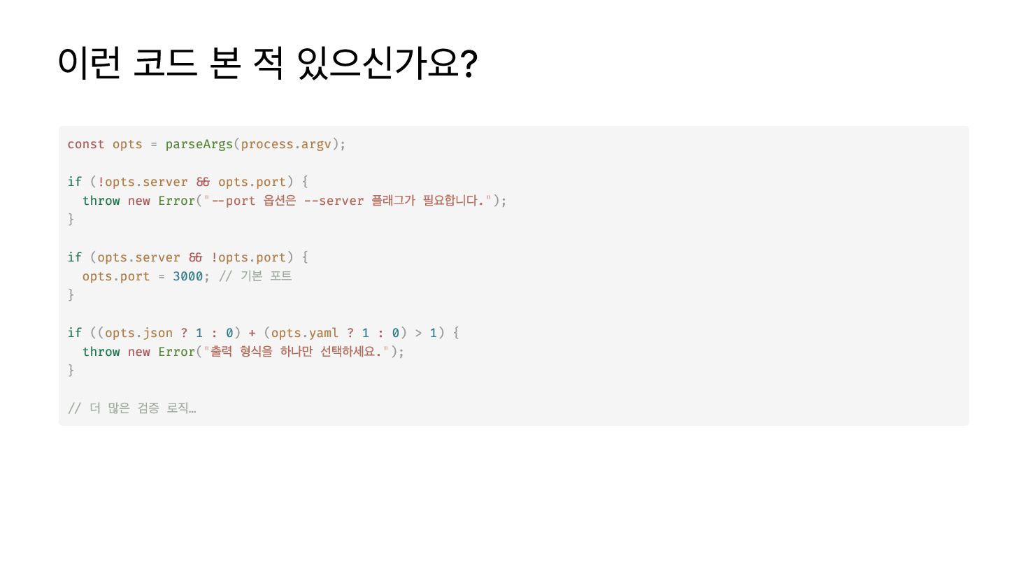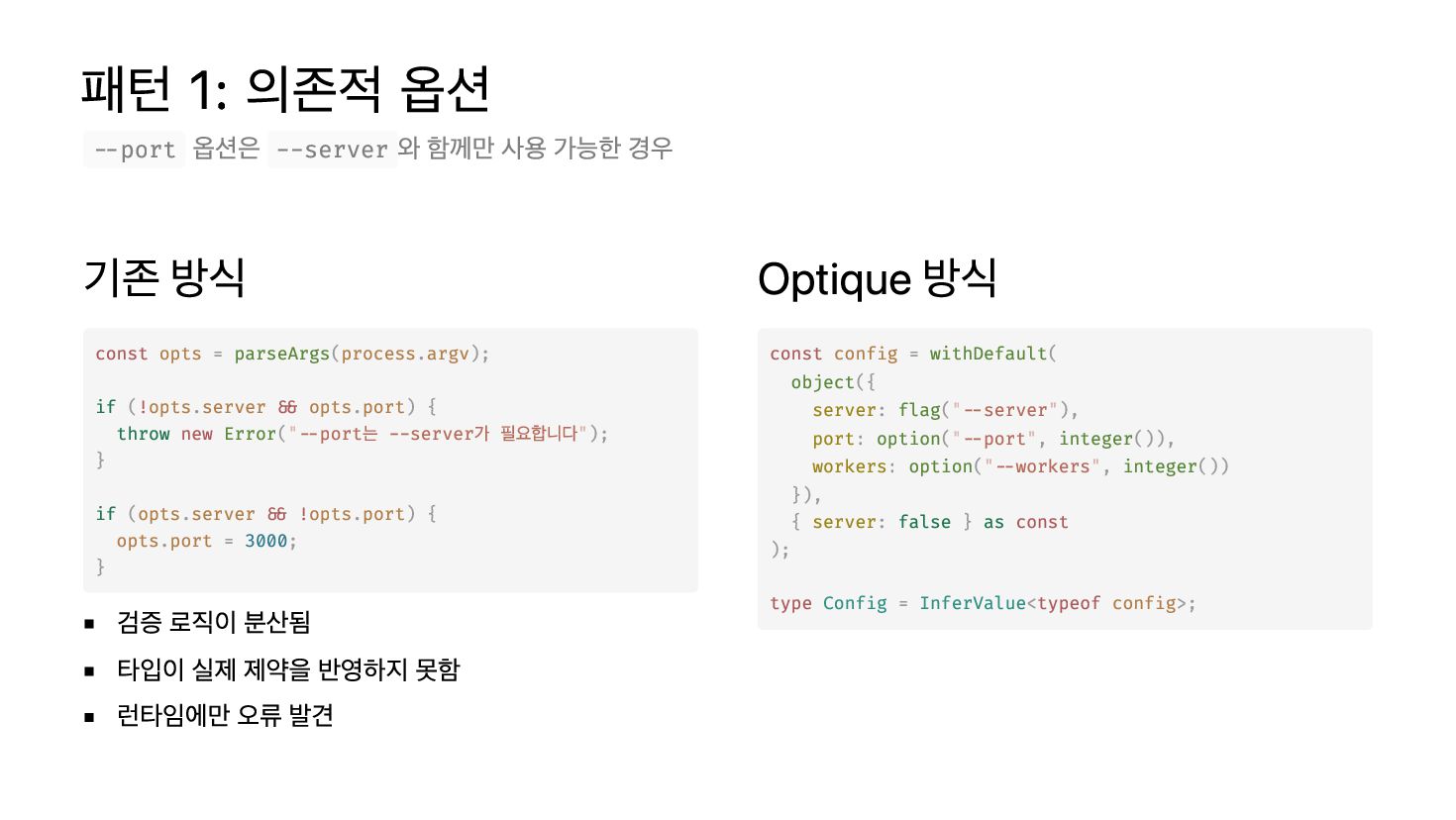 실제 제약을 반영하지 못함 런타임에만 오류 발견 Optique 방식 --port 옵션은 --server 와 함께만 사용 가능한 경우 const opts = parseArgs(process.argv); if (!opts.server && opts.port) { throw new Error("--port는 --server가 필요합니다"); } if (opts.server && !opts.port) { opts.port = 3000; } const = ( ({ : ("--server"), : ("--port", ()), : ("--workers", ()) }), { : false } as ); type = <typeof >; config withDefault object server flag port option integer workers option integer server const Config InferValue config