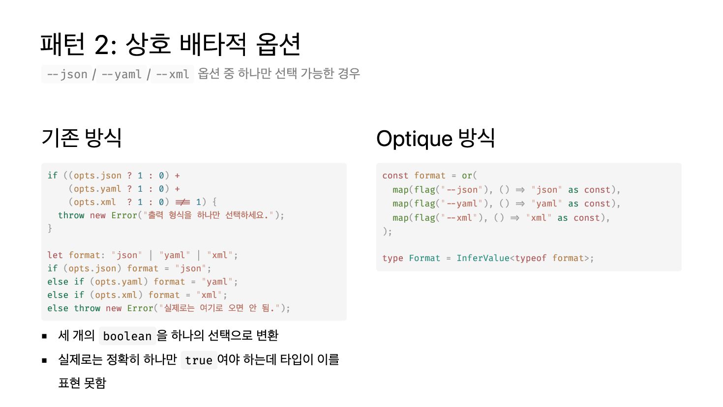 을 하나의 선택으로 변환 실제로는 정확히 하나만 true 여야 하는데 타입이 이를 표현 못함 Optique 방식 --json / --yaml / --xml 옵션 중 하나만 선택 가능한 경우 if ((opts.json ? 1 : 0) + (opts.yaml ? 1 : 0) + (opts.xml ? 1 : 0) !== 1) { throw new Error("출력 형식을 하나만 선택하세요."); } let format: "json" | "yaml" | "xml"; if (opts.json) format = "json"; else if (opts.yaml) format = "yaml"; else if (opts.xml) format = "xml"; else throw new Error("실제로는 여기로 오면 안 됨."); const = ( ( ("--json"), () => "json" as ), ( ("--yaml"), () => "yaml" as ), ( ("--xml"), () => "xml" as ), ); type = <typeof >; format or map flag const map flag const map flag const Format InferValue format