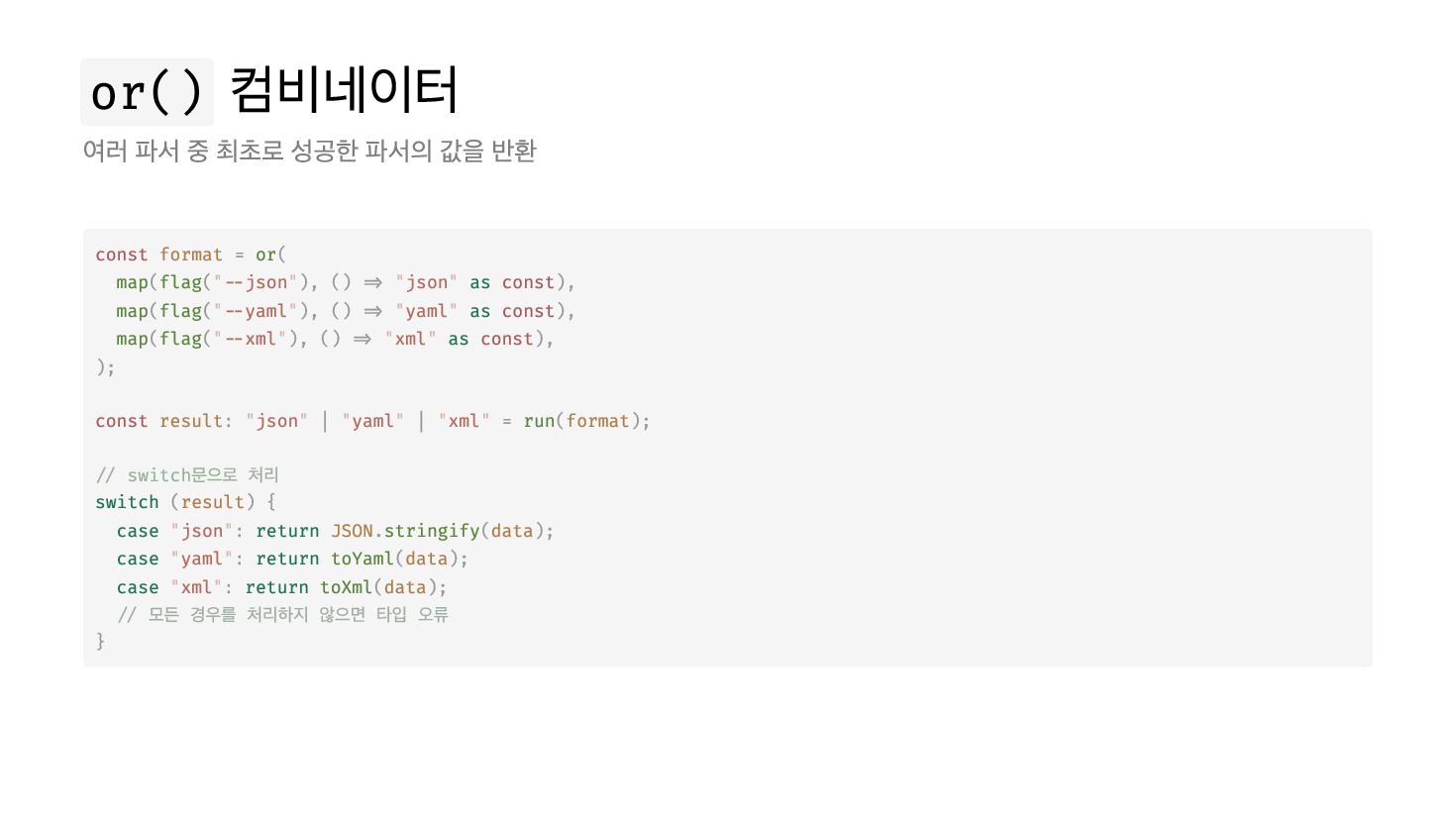 const = ( ( ("--json"), () => "json" as ), ( ("--yaml"), () => "yaml" as ), ( ("--xml"), () => "xml" as ), ); const : "json" | "yaml" | "xml" = ( ); // switch문으로 처리 switch ( ) { case "json": return . ( ); case "yaml": return ( ); case "xml": return ( ); // 모든 경우를 처리하지 않으면 타입 오류 } format or map flag const map flag const map flag const result run format result JSON stringify data toYaml data toXml data