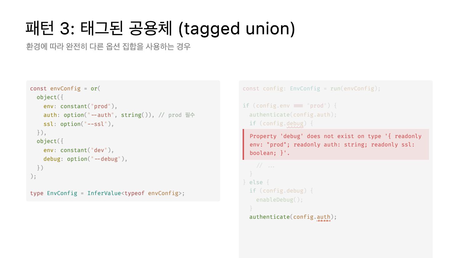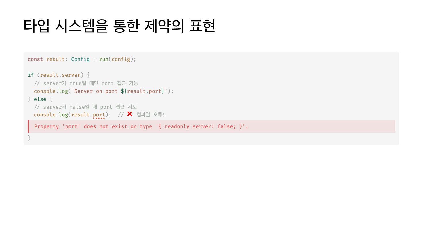 if ( . ) { // server가 true일 때만 port 접근 가능 . (`Server on port ${ . }`); } else { // server가 false일 때 port 접근 시도 . ( .port); // ❌ 컴파일 오류! } result Config run config result server console log result port console log result Property 'port' does not exist on type '{ readonly server: false; }'.