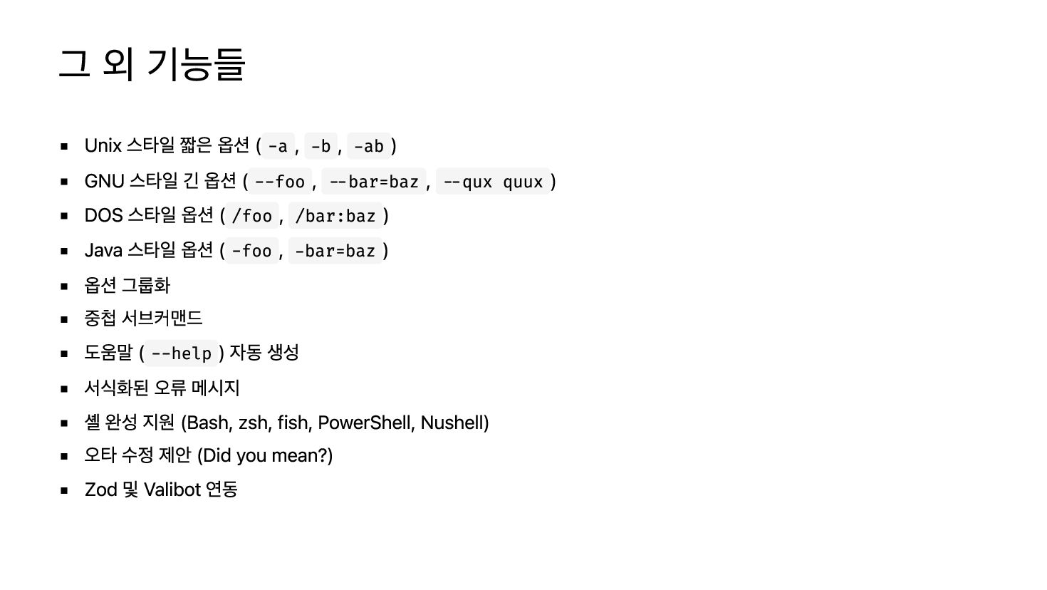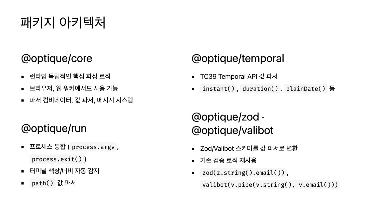워커에서도 사용 가능 파서 컴비네이터, 값 파서, 메시지 시스템 @optique/run 프로세스 통합 ( process.argv , process.exit() ) 터미널 색상/너비 자동 감지 path() 값 파서 @optique/temporal TC39 Temporal API 값 파서 instant() , duration() , plainDate() 등 @optique/zod · @optique/valibot Zod/Valibot 스키마를 값 파서로 변환 기존 검증 로직 재사용 zod(z.string().email()) , valibot(v.pipe(v.string(), v.email()))