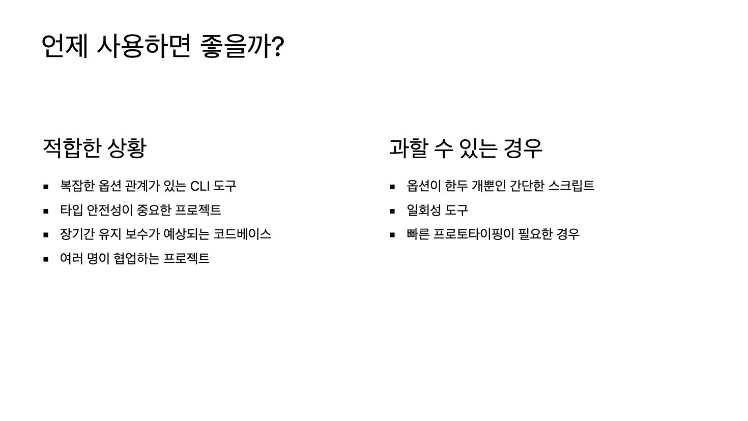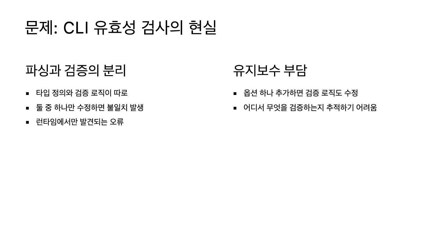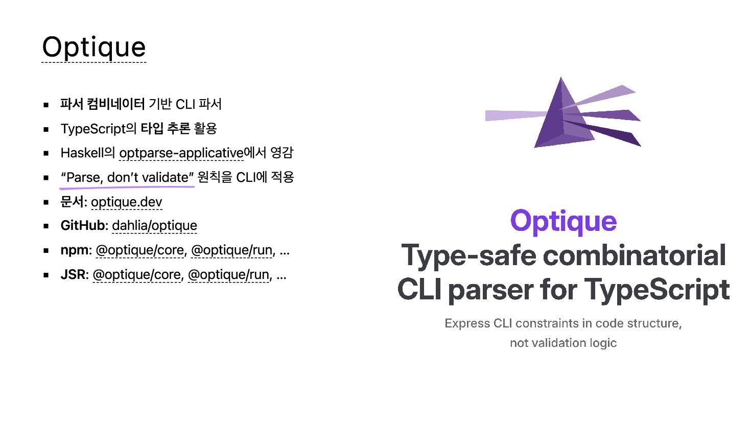 Optique는 TypeScript를 위한 타입 안전 조합형 CLI 파서 라이브러리로, “Parse, don't validate” 원칙에 따라 런타임 유효성 검사 대신 파서 구조 자체로 제약을 표현합니다. 이 발표에서는 의존적 옵션, 상호 배타적 옵션, 태그된 공용체라는 세 가지 핵심 패턴을 통해 Optique의 접근 방식을 소개합니다.