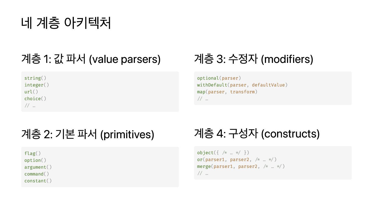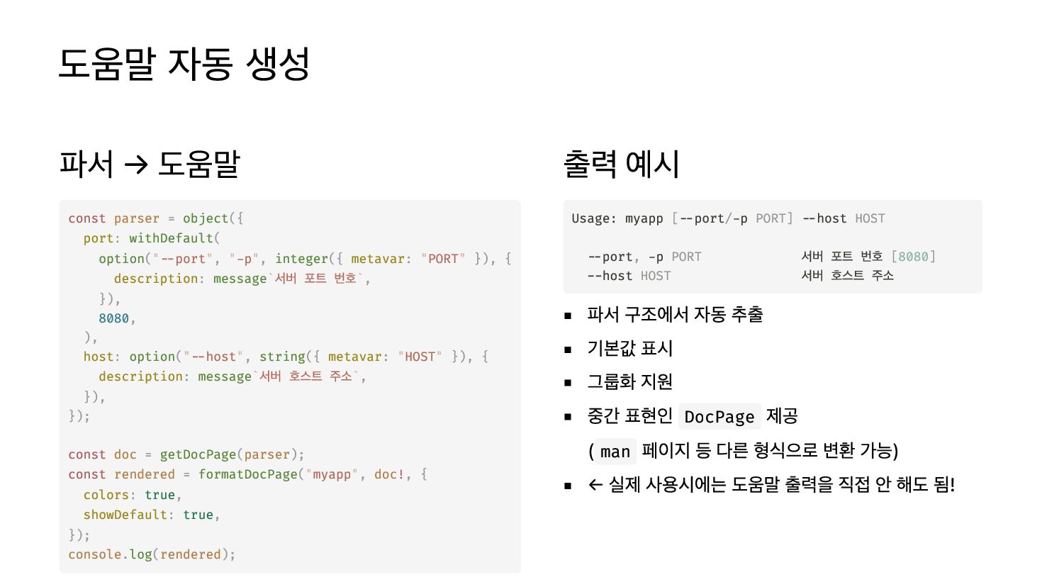 ( ("--port", "-p", ({ : "PORT" }), { : `서버 포트 번호`, }), 8080, ), : ("--host", ({ : "HOST" }), { : `서버 호스트 주소`, }), }); const = ( ); const = ("myapp", !, { : true, : true, }); . ( ); 출력 예시 파서 구조에서 자동 추출 기본값 표시 그룹화 지원 중간 표현인 DocPage 제공 ( man 페이지 등 다른 형식으로 변환 가능) ← 실제 사용시에는 도움말 출력을 직접 안 해도 됨! parser object port withDefault option integer metavar description message host option string metavar description message doc getDocPage parser rendered formatDocPage doc colors showDefault console log rendered Usage: myapp [--port/-p PORT] --host HOST --port, -p PORT 서버 포트 번호 [8080] --host HOST 서버 호스트 주소